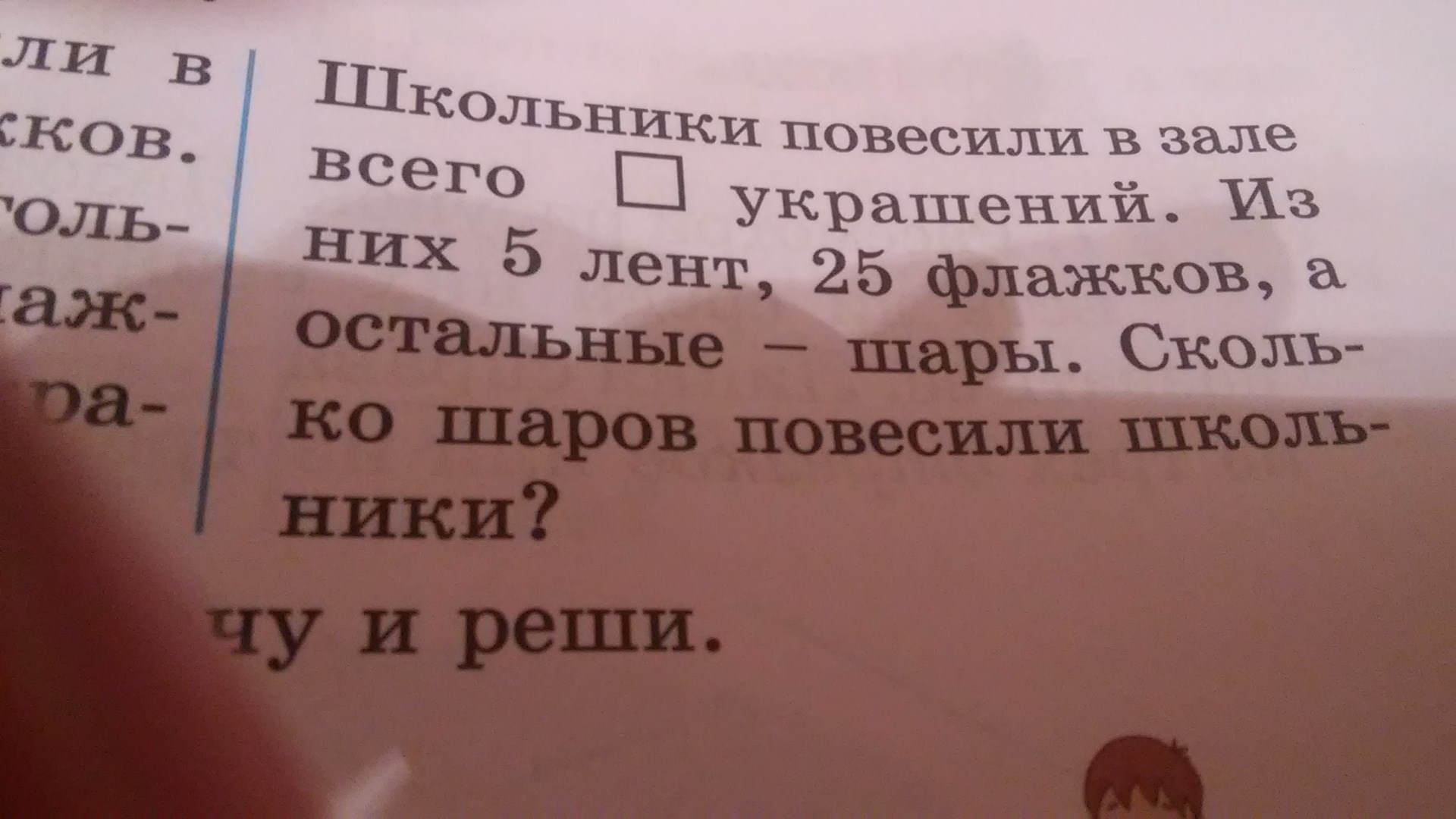 Школьники повесили 50 украшений, их них 5 лент, 25 флажков, остальные шары. Сколько шаров?