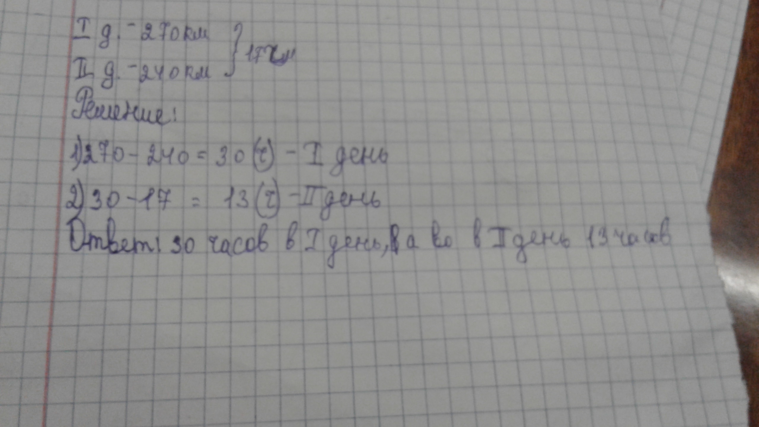 Помогите пожалуйста:Танк в первый день учений проехал 270 км,а второй день 240 км.Всего танк был в пути 17 часов.Сколько часов танк был в пути каждый день,если он двигался с одинаковой скоростью?
