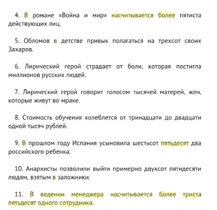 1-Пятисот,2-триста,3-миллионов,4-тысяч,5-двадцати одного,6-шестьсот пятьдесят второго,--7--,8-трехсот пятидесяти одного.