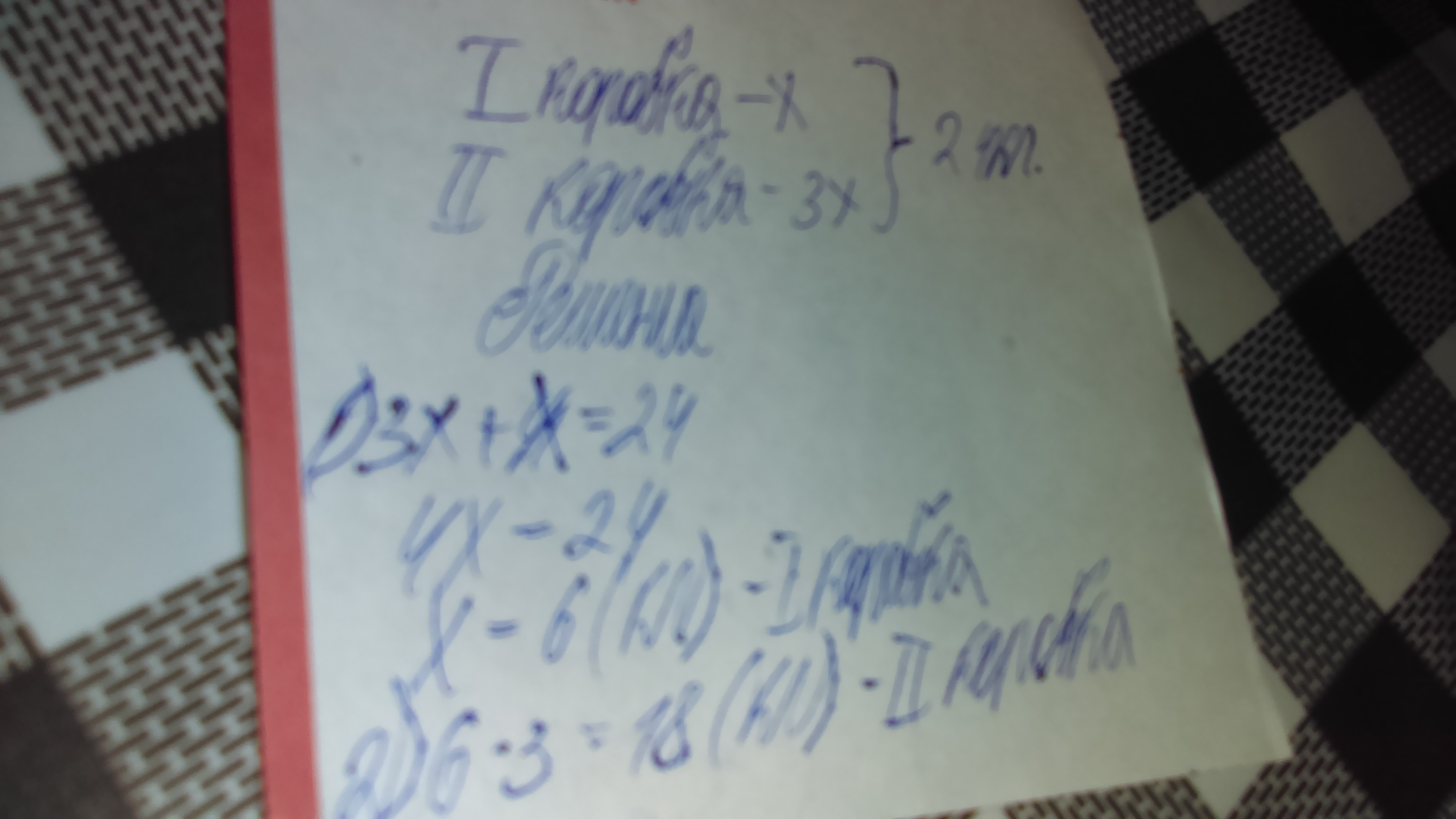 в двух коробках было 24 кг лука. во второй в 3 раза больше, чем в первой. сколько кг лука было в каждой коробке