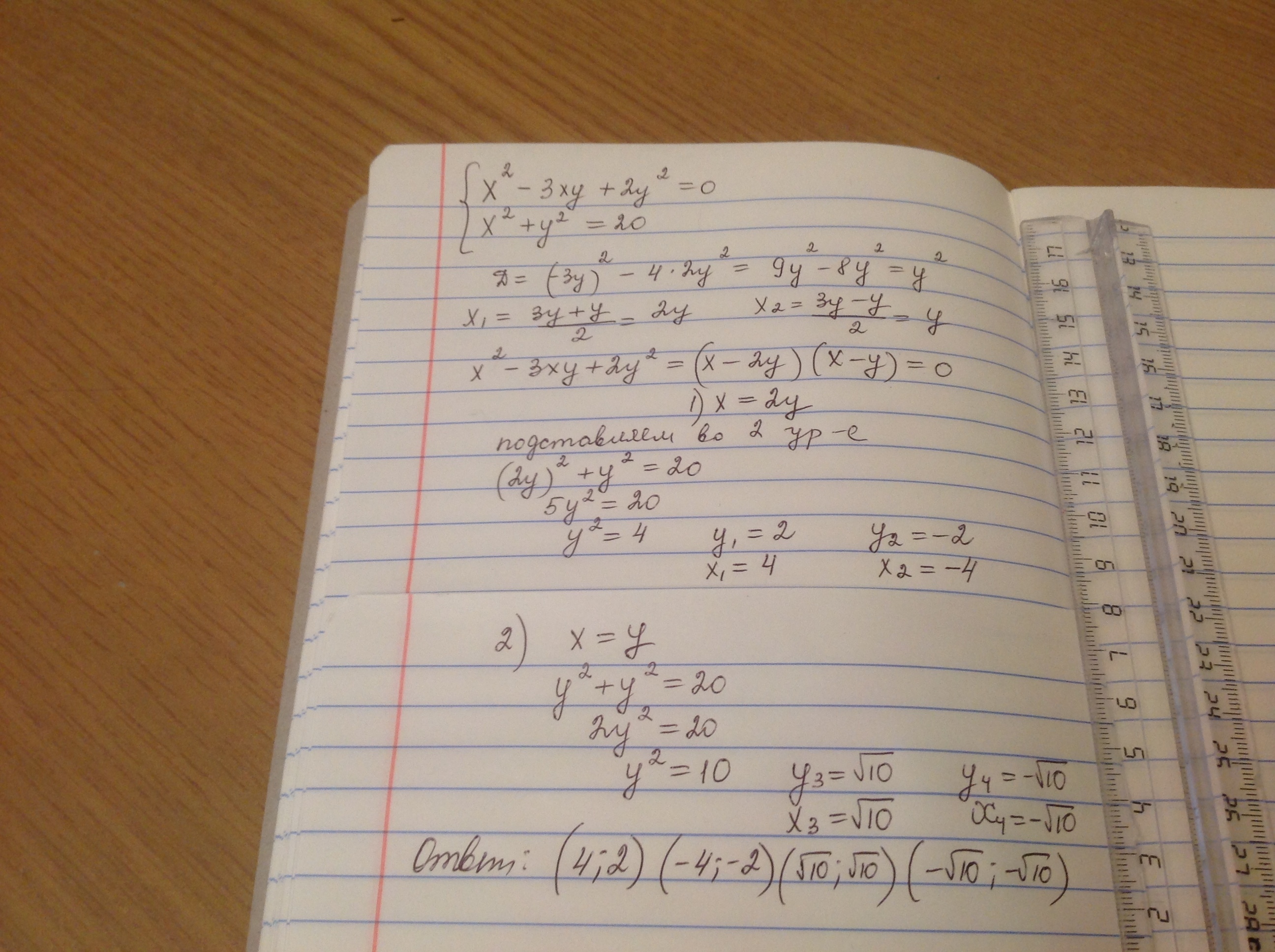 left { {{x^2-3xy+2y^2=0} atop {x^2+y^2=20}} right.