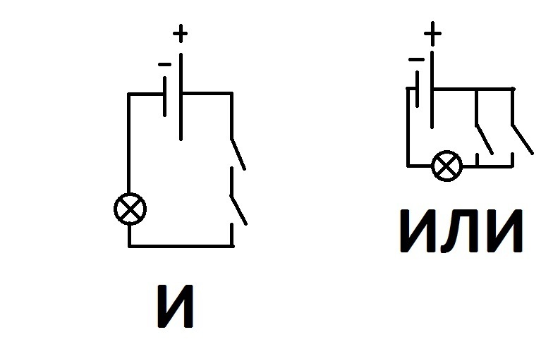 (На 1 схеме лампочка горит, если включены оба ключа. На 2 - если включен 1 из них.)