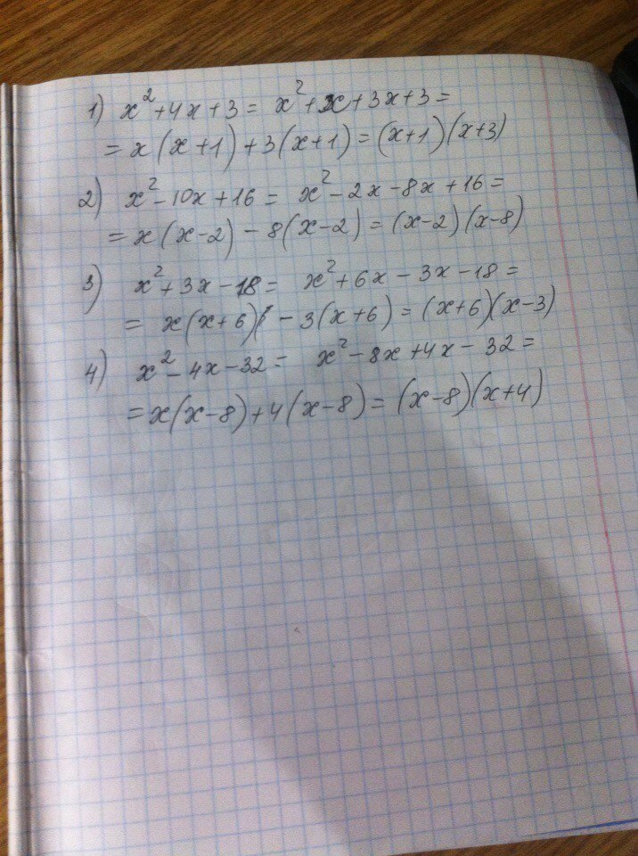 Разложите на множители трехчлен, представив предварительно один из его членов в виде суммы подобных слагаемых: 1) x^2+4x+3; 2) x^2-10x+16; 3) x^2+3x-18; 4) x^2-4x-32. 7 КЛАСС