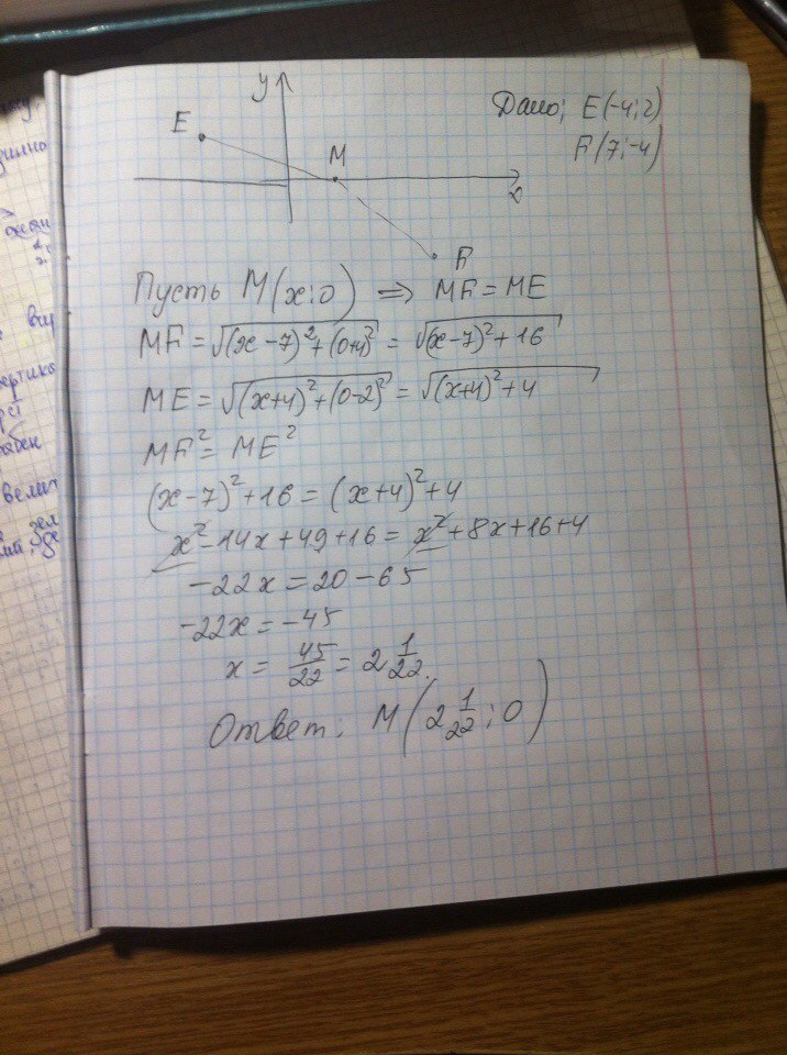 Найдите на оси абсцисс точку одинаково удаленную от точек E(-4, 2) и F(7, -4).