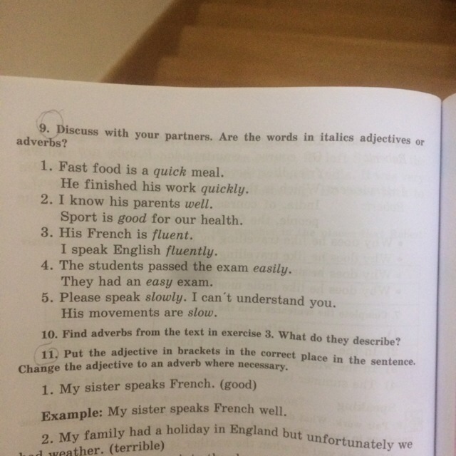 11. Put the adjective in brackets in the correct place in the Change the adjective to an adverb where necessary. My sister speaks French. (good) Example: My sister speaks French well. 2. My family had a holiday in England but unfortunately we had weather. 3. The children came into the classroom. (noisy) 4. Please listen. (careful) cook. (good) Please explain. (clear) 7. I want a snack. (quick 8. He speaks English. (good) 9. My sister passed her exam. (easy)