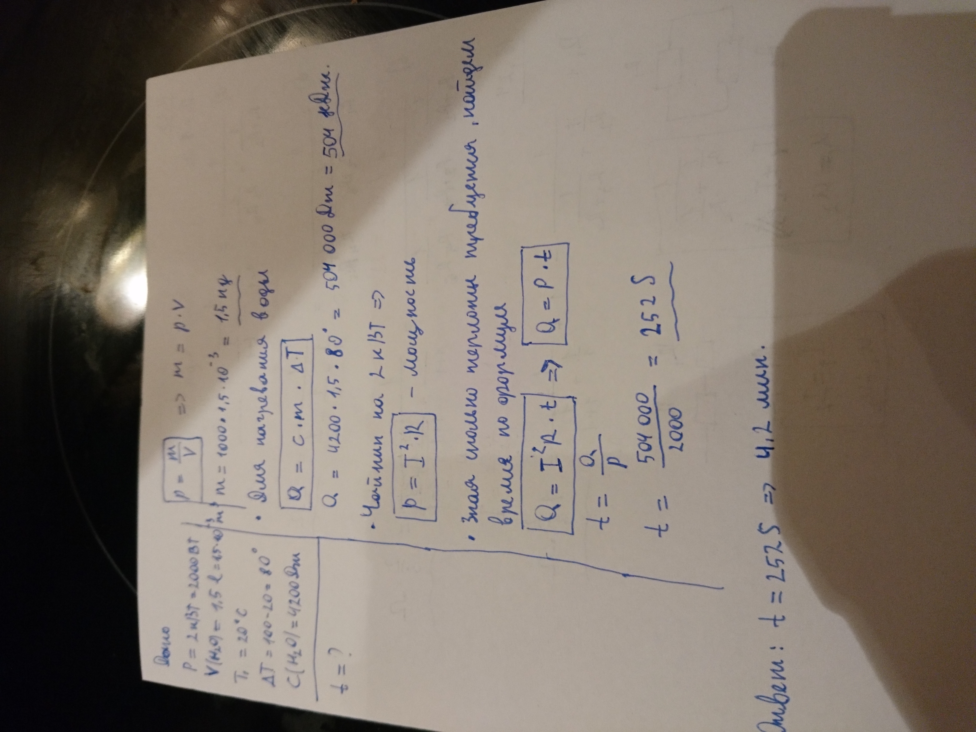 Электрический чайник мощностью 2 кВт содержит 1,5 л воды при температуре 20 ∘C. Сколько времени (в мин) потребуется, чтобы нагреть эту воду до кипения? Считайте, что все тепло, выделяющееся чайником, тратится на нагревание только воды. Удельная теплоемкость воды 4200 Дж/(кг⋅ ∘C), плотность воды 1000 кг/м3.