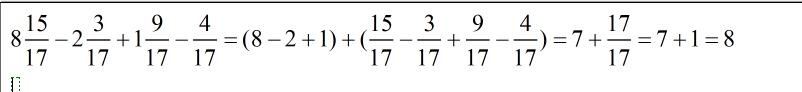 8 15/17-2 3/17=6 12/17 +1 9/17=7 21/17-4/7=7 17/17=8