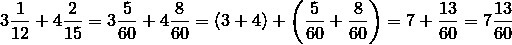 3 1/12+4 2/15=37/12+62/15=185/60+248/60=433/60= 7 13/60
