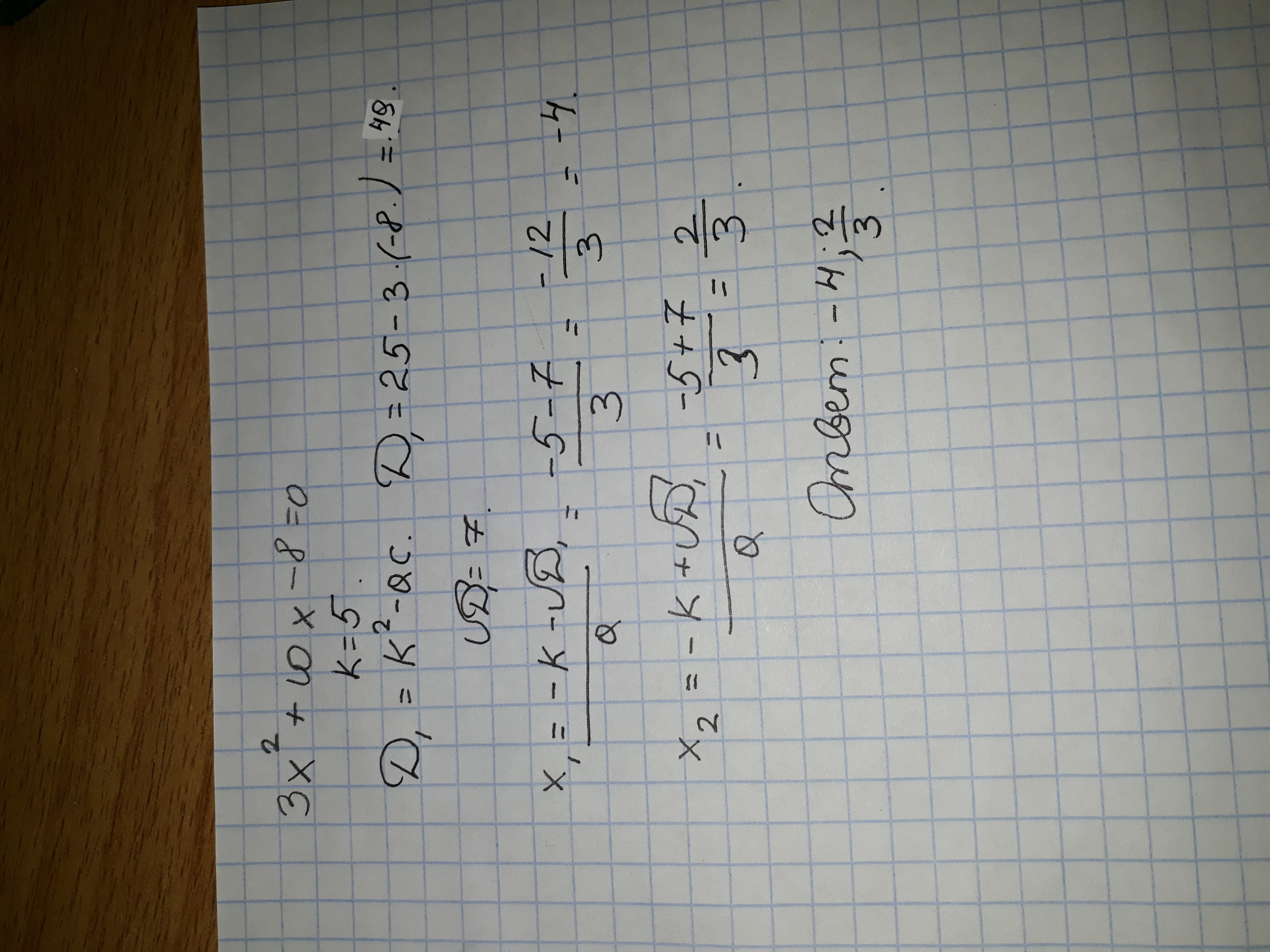 Решите уравнение используя формулу корней квадратного уравнения с четным коэффициентом при x: б) 3x^2+10x-8=0