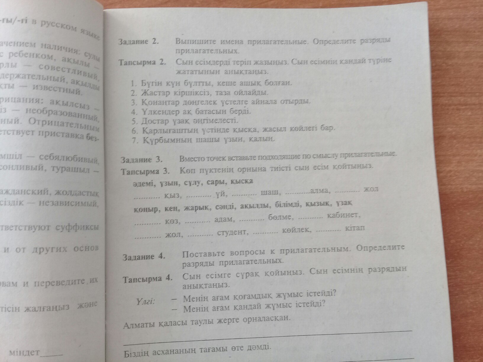 3. сұлу қыз, əдемі , ұзын, сары, қысқа, қоңыр, ақылды, жарық бөлме, кең , ұзақ, білімді, сəнді , қызық кітап.