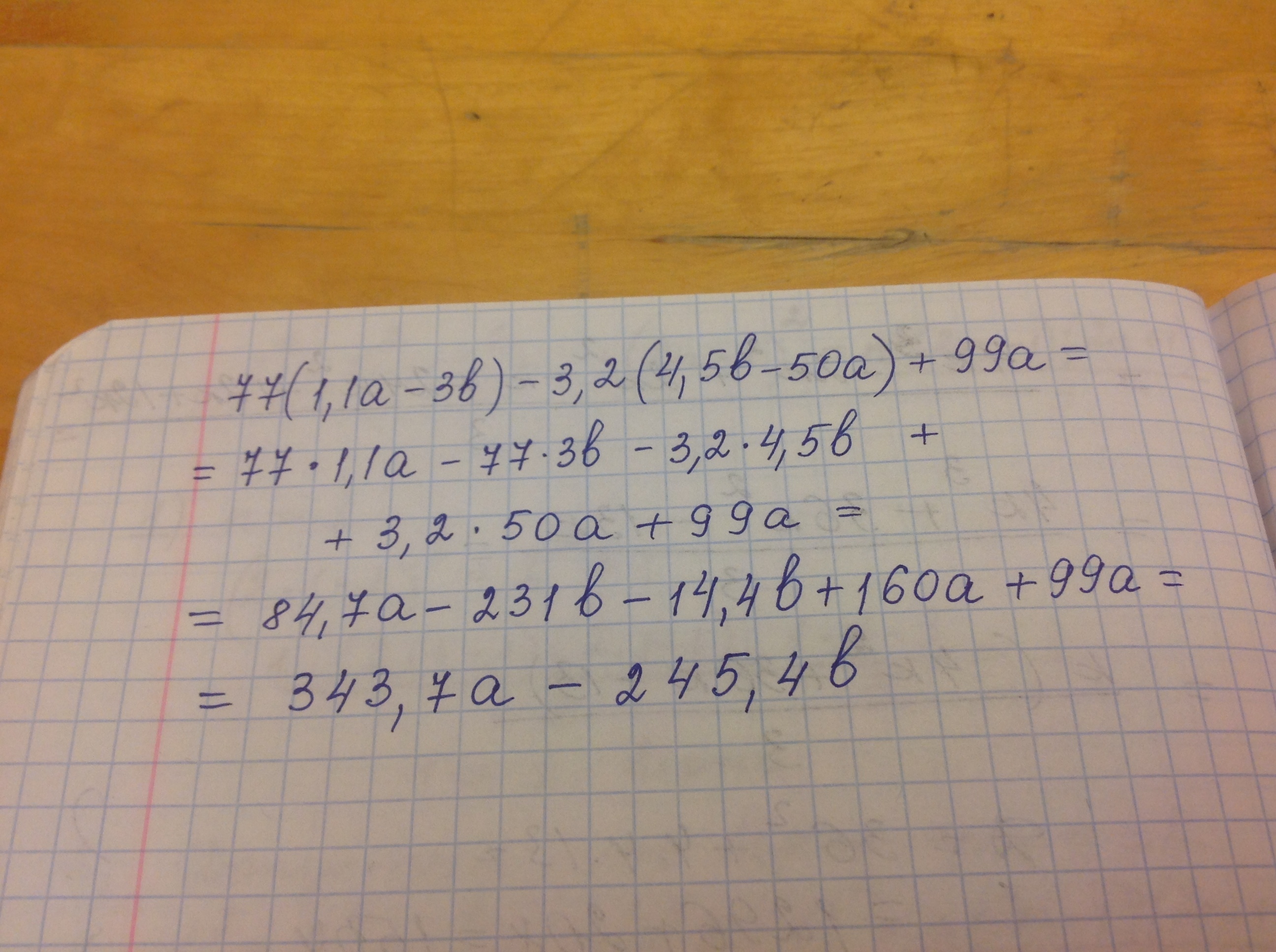 Преобразуйте тождественно равное выражение 77 (1,1a-3b)-3,2 (4,5b-50a)+99a