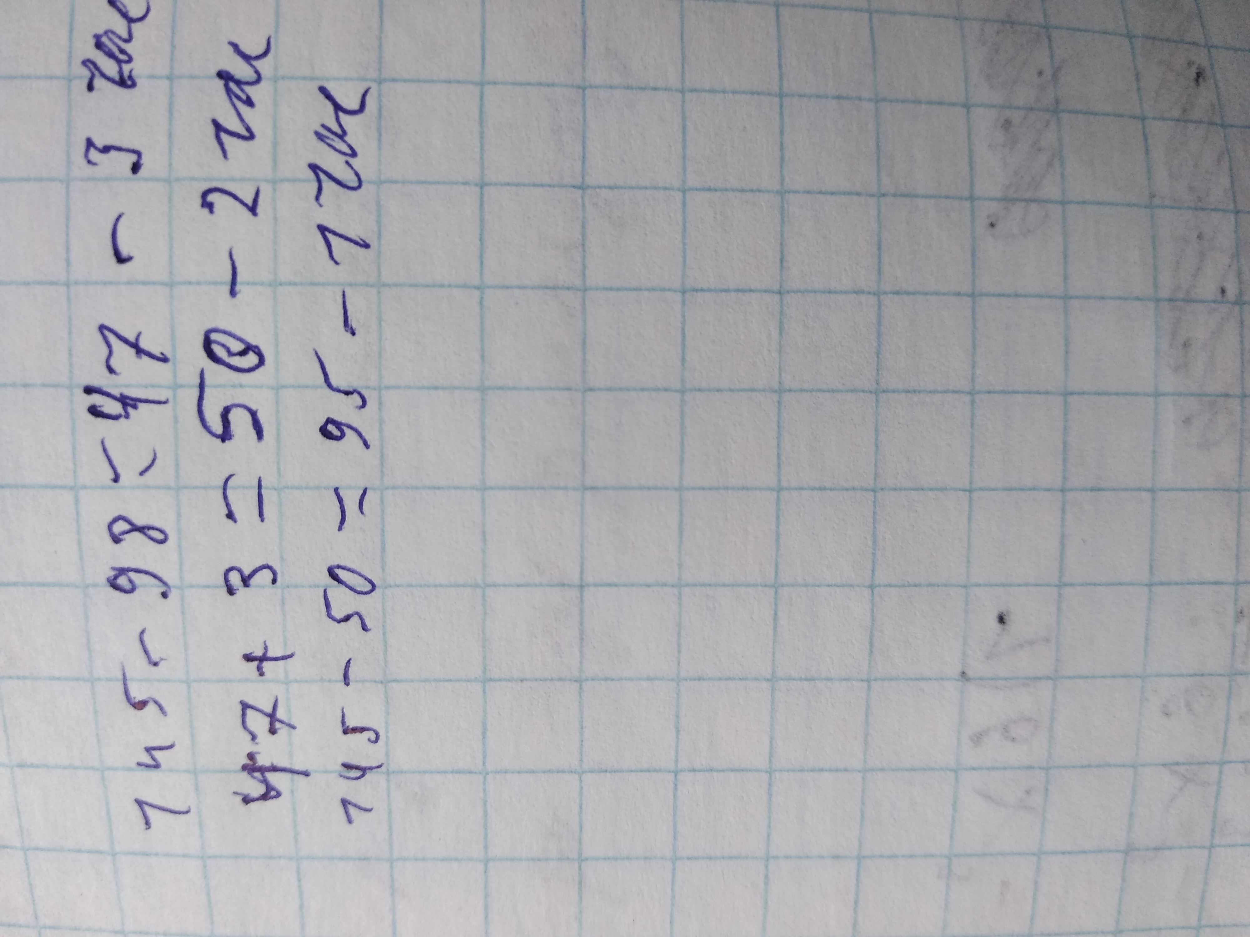Электричка за три часа проехала 145 км. Сколько километров она проезжала за каждый из этих часов, если за первые два часа она проехала 98 км, а за третий час на 3 км меньше, чем за второй? Помогите. Срочно!!