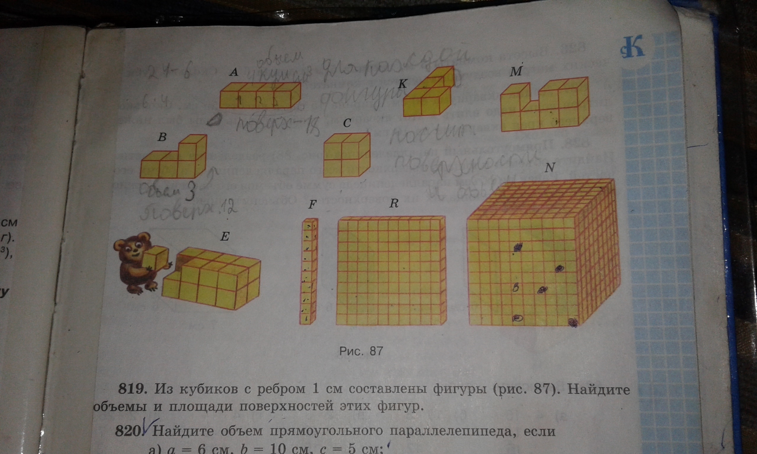 из кубиков с ребром 1 см составлены фигуры.найдите объемы и площади поверхностей этих фигур (на карандаш не обращайте внимания!)