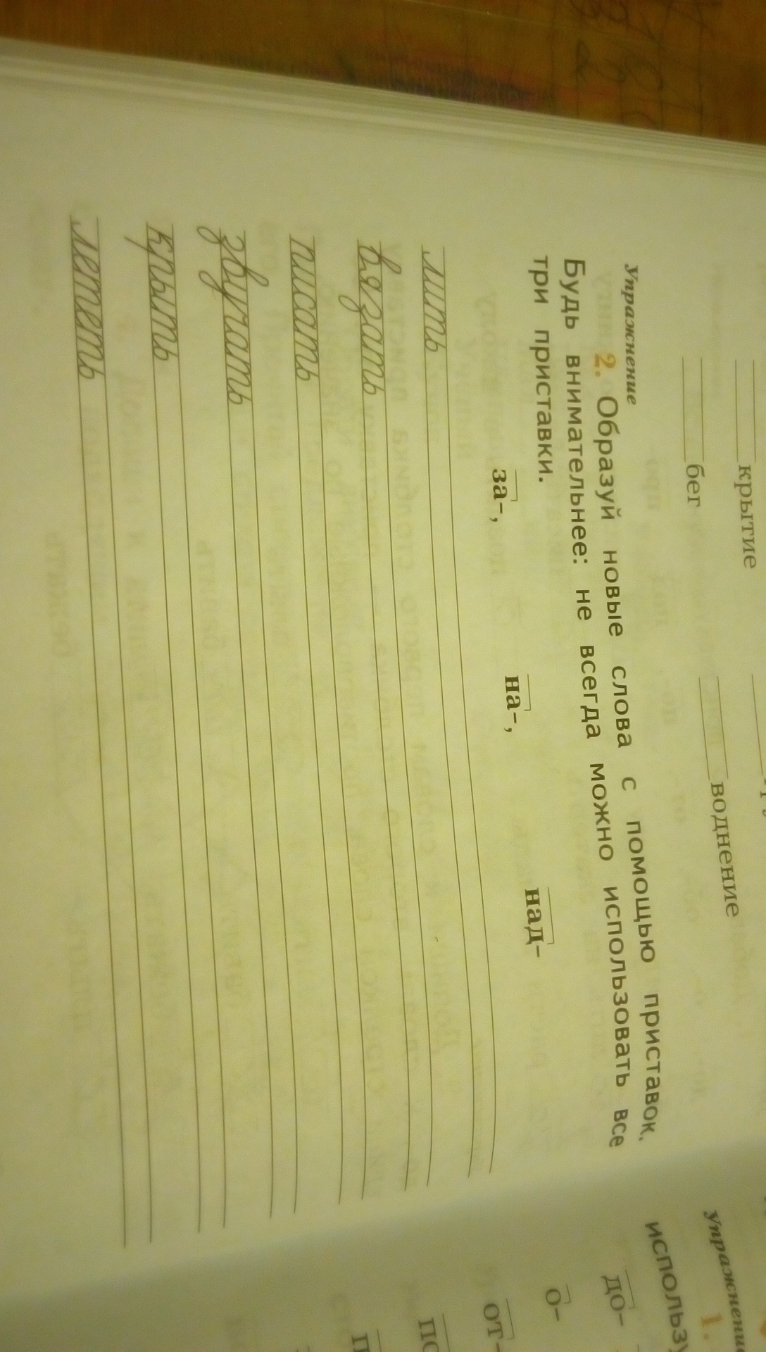 "за" со всеми словами, налить, написать, налететь, накрыть;надписать,надвязать,надлететь