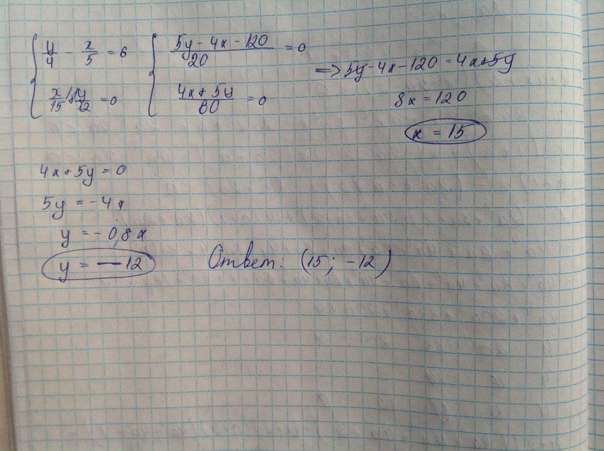 у/4-х/5=6 и х/15+у/12=0