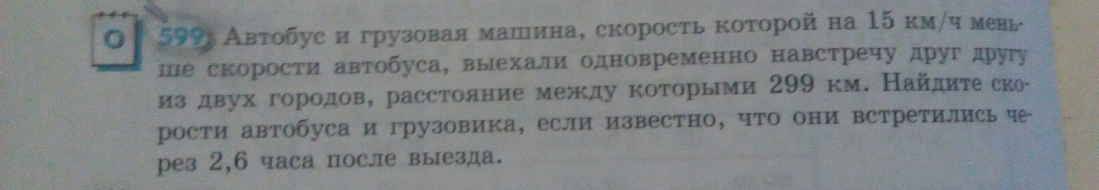 Ответ: скорость автобуса 65 км/ч, скорость грузовика 50 км/ч