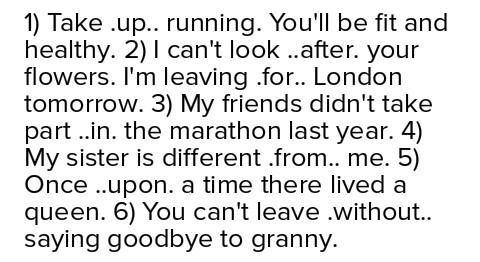 1) Возьмитесь за работу. Будете здоровым. 2) Я не могу ухаживать за твоими цветами. Я переезжаю в Лондон завтра. 3) Мои друзья не принимали участие в марафоне в прошлом году. 4) Моя сестра отличается от меня. 5) Когда-то жила королева... 6) Вы не можете уйти без прощания с бабушкой.