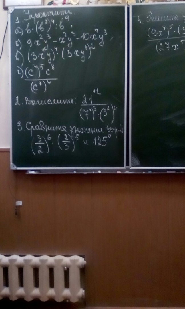 b*(b^3)^4:b^9=b*b^1^2:b^9=b*b^3=b^4 \ 9x^2y^3-x^2y^3-10x^2y^3=-2x^2y^3 \ (3x^2y)^4*(3xy^3)^2=3x^8y^4*3x^2y^6=9x^1^0y^1^0 \  frac{(c^4)^5c^8}{(c^7)^4}= frac{c^2^0c^8}{c^2^8}= frac{c^2^8}{c^2^8}=1 \  \  frac{21^1^2}{(7^4)^3(3^2)^4}= frac{7^1^2*3^1^2}{7^1^2*3^8}= frac{3^1^2}{3^8}=3^4=81 \  \ ( frac{3}{2})^6*( frac{2}{3})^5=( frac{3}{2})^6*( frac{3}{2})^-^5= frac{3}{2}=1,5 \ 125^0=1 \  1,5 textgreater  1