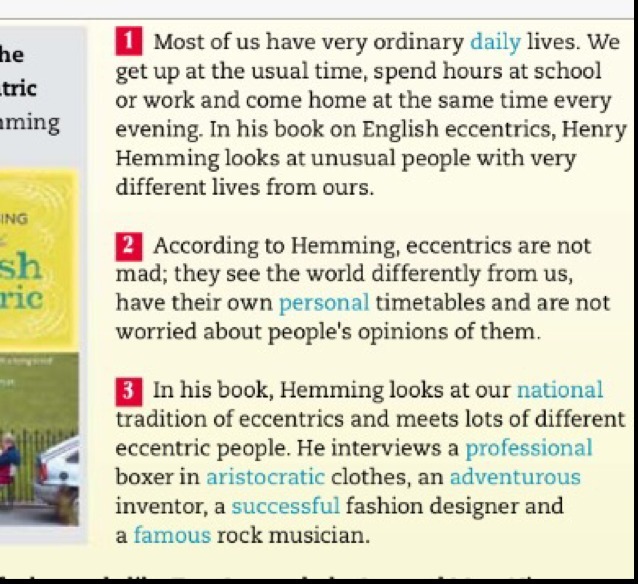 Большинство из нас имеют очень обычной повседневной жизни. Мывставать в обычное время, тратить часы в школеили работы и приходить домой в то же время каждыйвечер. В своей книге на английском чудаков, ГенриХемминг смотрит на необычных людей с оченьотличается жизнь от нашей2 По словам Хемминг, чудаков небезумный: они видят мир по-другому от нас,иметь свой собственный личный график и неволнует мнение людей о них.3 в своей книге, Подшивать смотрит на нашу национальнуютрадиции чудаков и встречает много разныхчудак человек. Он берет интервью у профессионалабоксер в аристократические одежды, авантюрныйизобретатель, успешный модельер иизвестный рок-музыкант