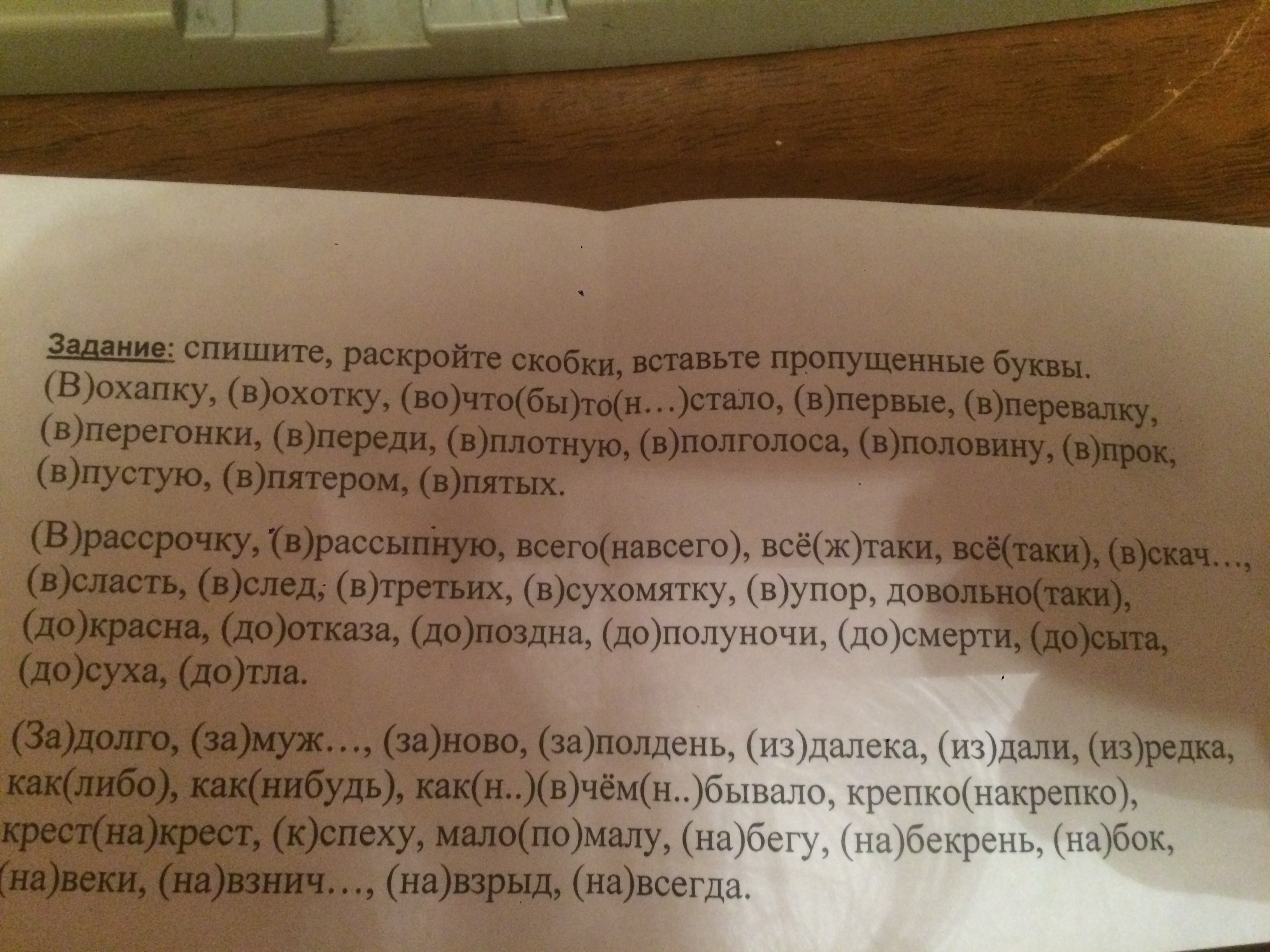 В рассрочку, врассыпную, всего-навсего, всё ж таки, всё-таки, вскачь, всласть, в-третьих, всухомятку, в упор, довольно-таки, докрасна, до отказа, допоздна, до полуночи, до смерти, досыта, досуха, дотла.