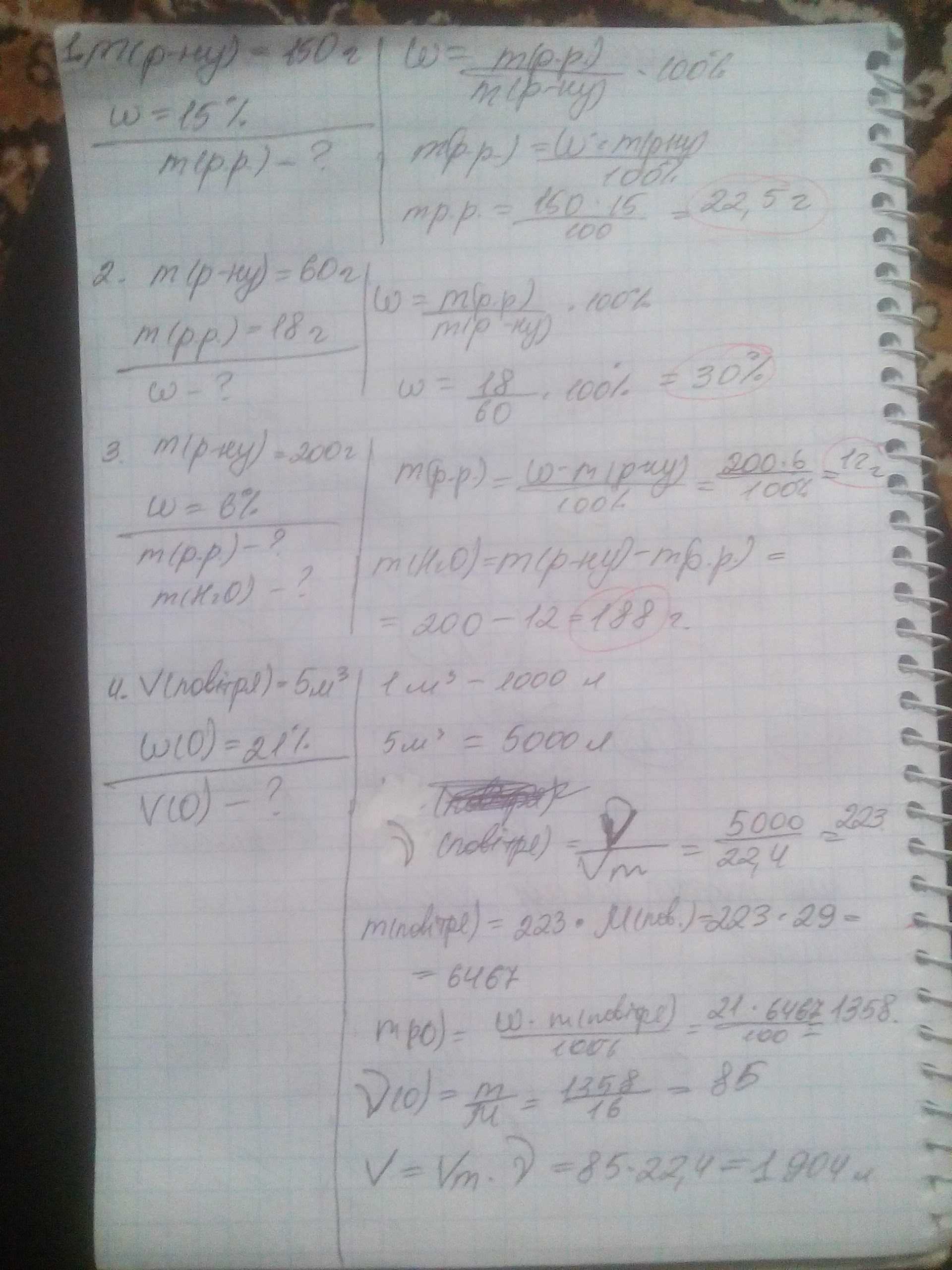 1. Определите массу доли, содержащейся в 150г раствора с массовой долей соли 15%. 2. В 60г раствора содержится 18г соли. Определите массовую долю соли в данном растворе. 3. Какие массы соли и воды потребуются для приготовления 200г ее 6% - ного раствора? 4. Какой объем кислорода может быть получен из 5м3 воздуха, если объемная доля кислорода в воздухе составляет 21%? 5. Определите массу чистого карбоната кальция в 5кг природного известняка, содержащего 12% примесей. 6. Определите массовые доли элементов в серной кислоте.