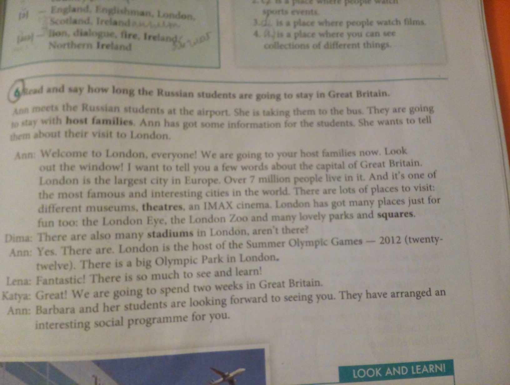 Анна встречает учеников в аэропорту. Забирает их на автобусе. Они собираются остаться в семьях, принимающих гостей. У Анны есть некоторая информация для учеников. Она хочет рассказать им о их поездке в Лондон.Анна: Добро пожаловать в Лондон! Сейчас мы направимся в ваши приемные семьи. Посмотрите в окно! Я хочу рассказать вам немного о столице Великобритании. Лондон — самый большой город в Европе. В нем проживает более 7 миллионов человек. И это один из самых известных и интересных городов в мире. Здесь находится множество достопримечательностей: различные музеи, детские театры, кинотеатры IМАХ. В Лондоне также много мест просто для развлечения: Лондонское колесо обозрения, лондонский зоопарк, много милых парков и площадей.Дима: В Лондоне много стадионов, не так ли?Анна: Да, это так. Лондон — столица летних Олимпийских Игр 2012. В Лондоне находится большой Олимпийский парк.Лена: Фантастика! Столько всего надо увидеть и узнать!Катя: Прекрасно! Мы собираемся провести 2 недели в Великобритании.Анна: Барбара и её ученики с нетерпением ждут вас. Они организовали для вас интересную культурную программу.