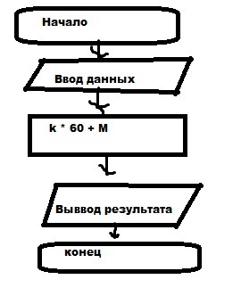 Фильм длится K часов и M минут. Составьте линейный алгоритм перевода длительности фильма в минуты.