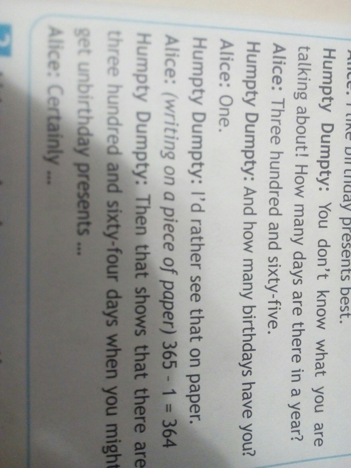 Хампти Дампти: Зэн зэт шоуз зэт зэра сри хандрид энд сиксти-фо дэйз увэн ю майт гет анбездэй презентс...