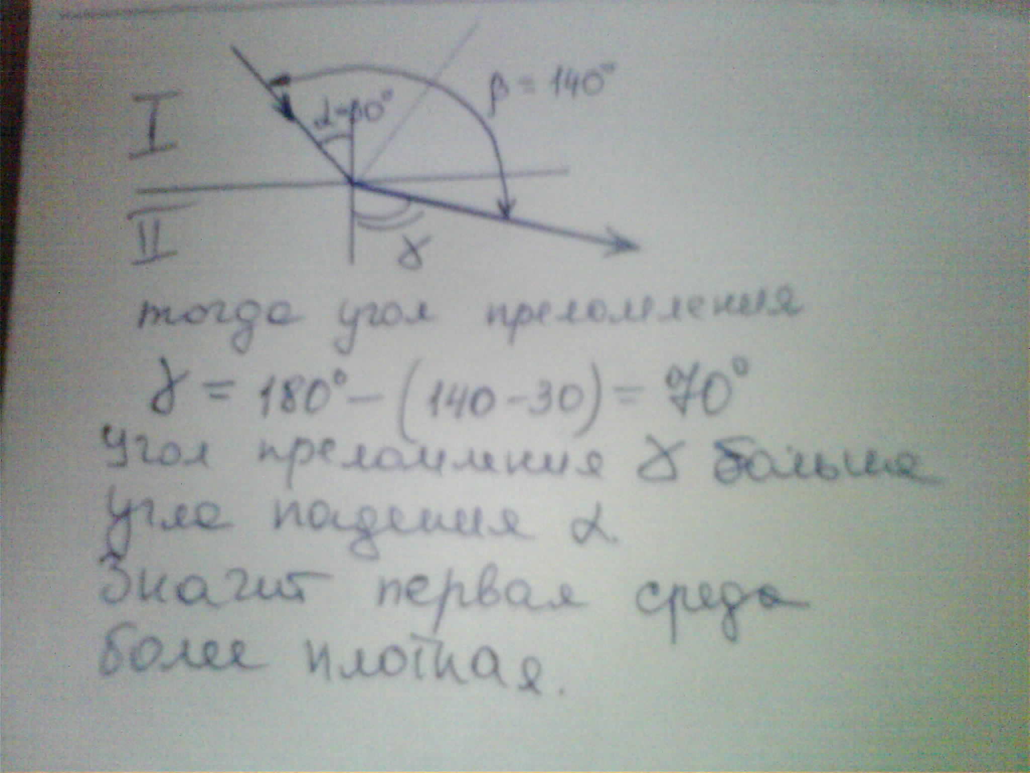 угол падения равен 30 градусов, а угол между падающим лучом и преломленным 140.В какой среде луч распространялся в начале:в оптически более плотной или менее плотной (нарисовать)