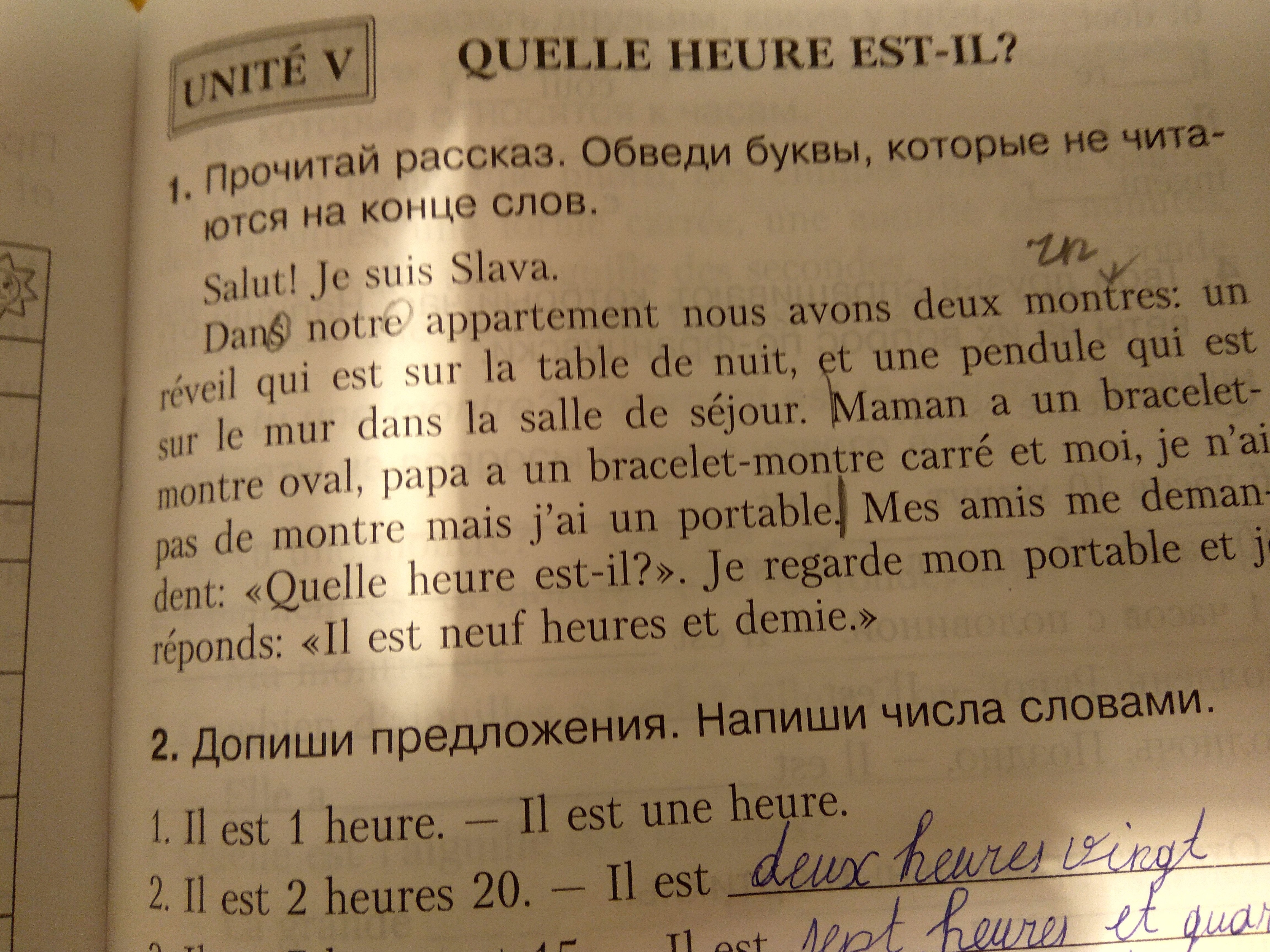 В нашей квартире есть двое часов: будильник, который стоит на тумбочке и настенные часы, которые висят в гостиной. У мамы есть наручные овальные, а у папы квадратные, а у меня нет часов, но есть мобильный телефон. Мои друзья меня спрашивают "Который час?". Я смотрю в свой телефон и отвечаю "Сейчас 9:30"