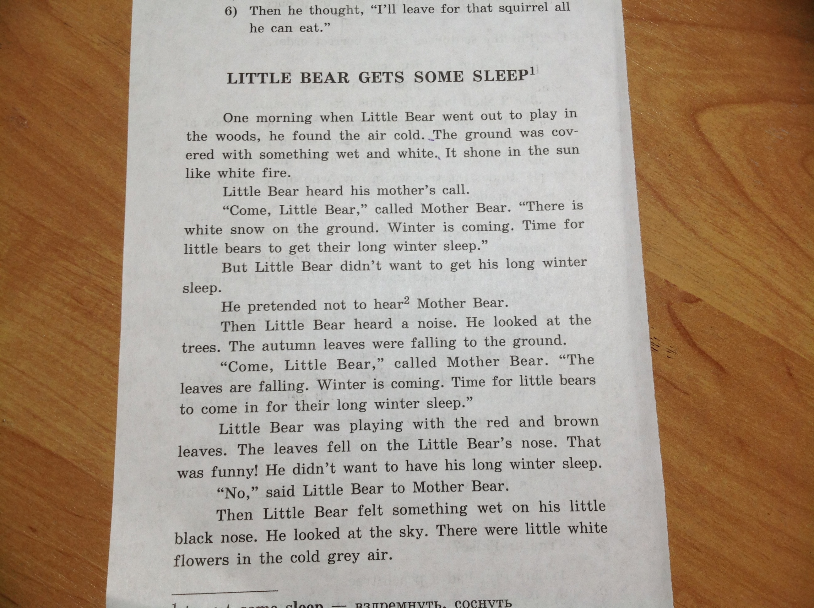 "Пошли, Медвежонок", позвала Мама Медведь. "На земле белый снег. Приближается зима. Время маленьких медвежат для их долгого зимнего сна."