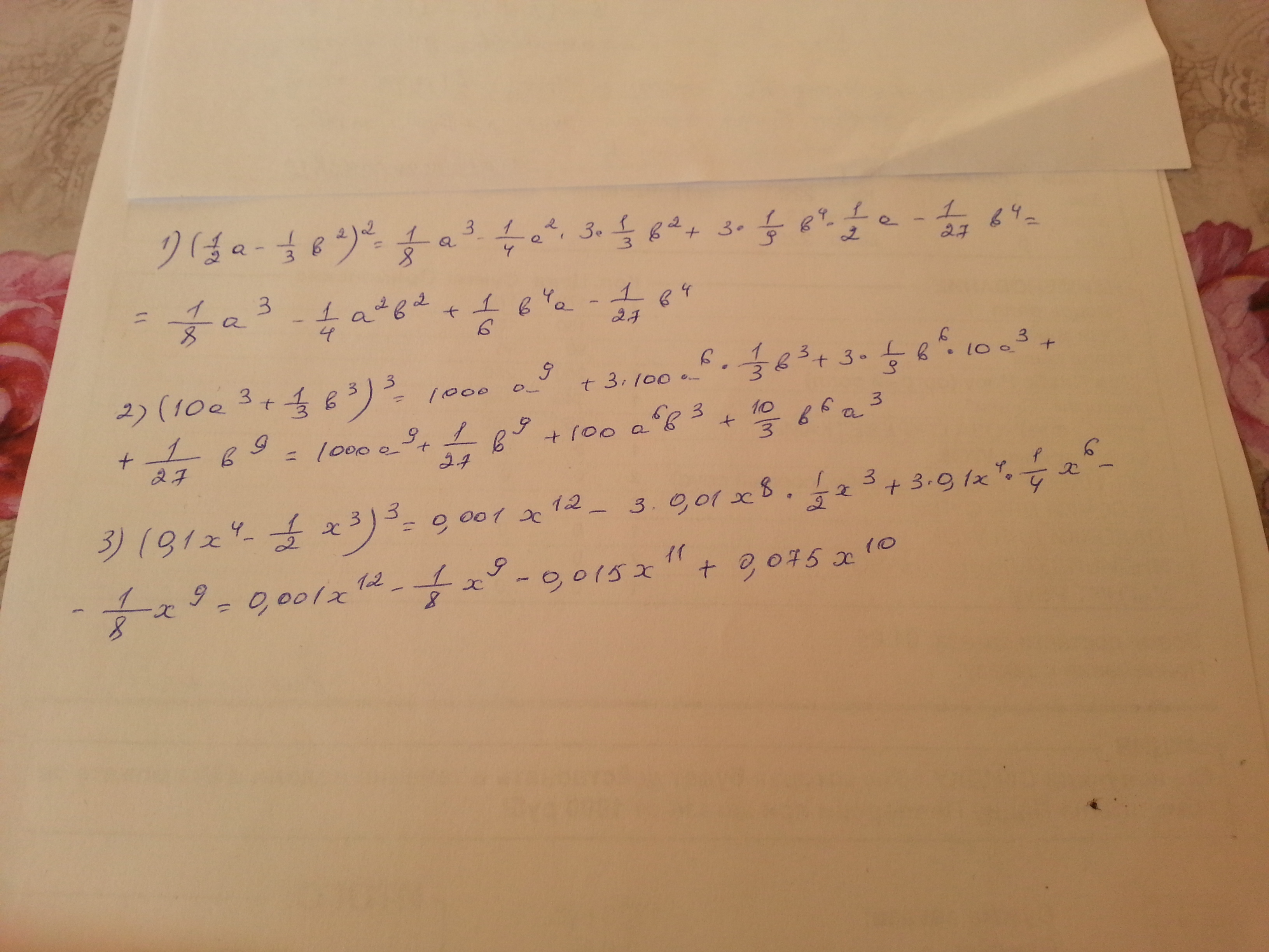 Представьте выражение в виде многочлена 1) (1/2а-1/3б^2)^2 3) (10а^3+1/3б^3)^3 5) (0,1х^4-1/2х^3)^3