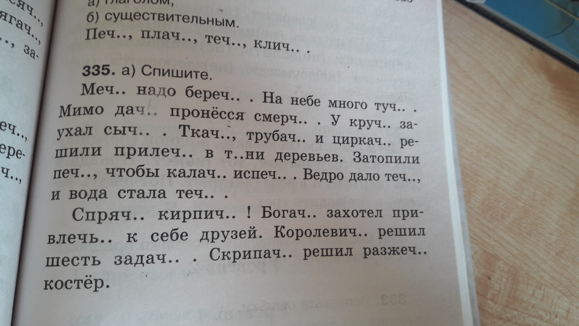 Меч, беречь, туч, дачи, смерч, Круче, Сыч, Ткач , трубач, циркач, прилечь, тени, печь, калач, испечь, течь, течь, Спрячь кирпич, богач, привлечь, Королевич, задач, скрипач, разжечь.