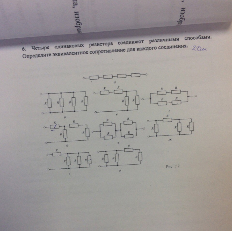ПОМОГИТЕ ПОЖАЛУЙСТА♥Четыре одинаковых резистора соединяют различными способами. Определите эквивалентное сопротивление для каждого соединения (сопротивление ровняется 2 ом)