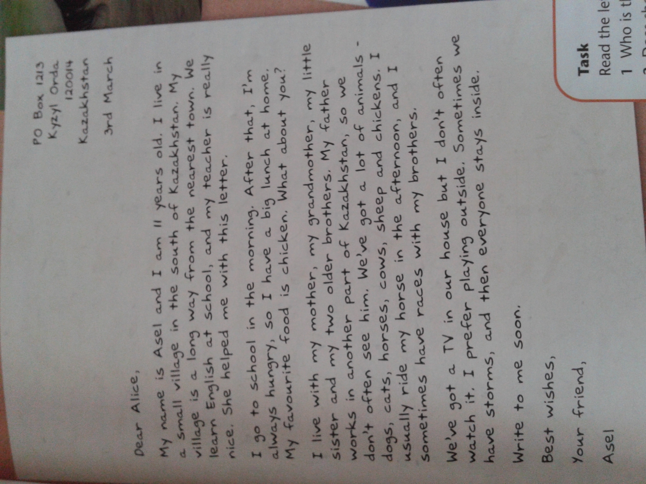 Дорогая Алиса, Меня зовут Асель и мне 11. Я живу в маленькой деревне на Кавказе в Северном от моей деревни города очень далек путь . мы учим английский в школе и мой учительница действительно хорошая. она помогала мне с этим письмом .я хожу в школу утром. Но я всегда после этого голоден Я обедаю дома. моя любимая еда цыпленок. А твоя? я живу с мамой бабушкой младшей сестрой с двумя старшими братьями. Мой папа работает в другой части Казахстана поэтому я не часто вижусь с ним. у нас много животных собаки кошки лошади коровы овцы и куры. я обычно катаюсь на моей лошади в полдень и немного races со своими братьями. У нас есть телевизор в нашем доме но я не часто смотрю его.I prefer playing...... прост лень переводить...