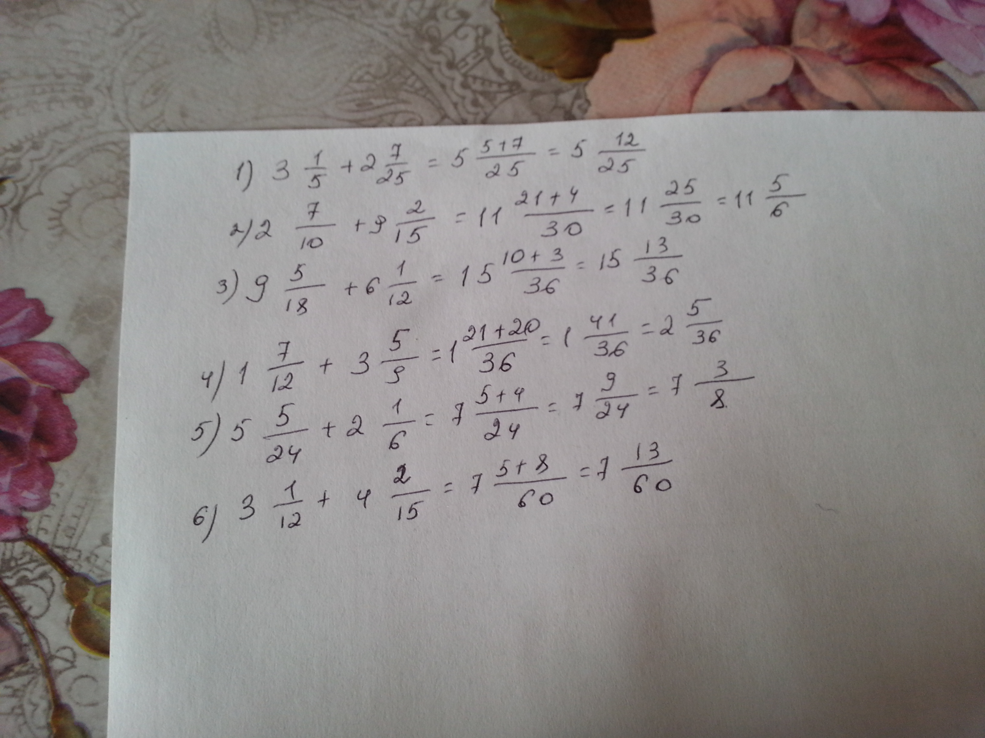 3 целых 1/5+2 целых 7/25. 2 целых 7/10+9 целых 2/15. 9 целых 5/18+6 целых 1/12. 1 целая 7/12+3 целых 5/9. 5 целых 5/24+2 целых 1/6 3 целых 1/12+4 целых 2/15
