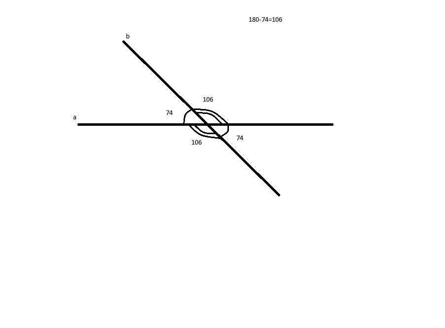 в результате пересечения двух прямых образовалось четыре угла,один из них составил 74 °. Вычислите все остальные углы.