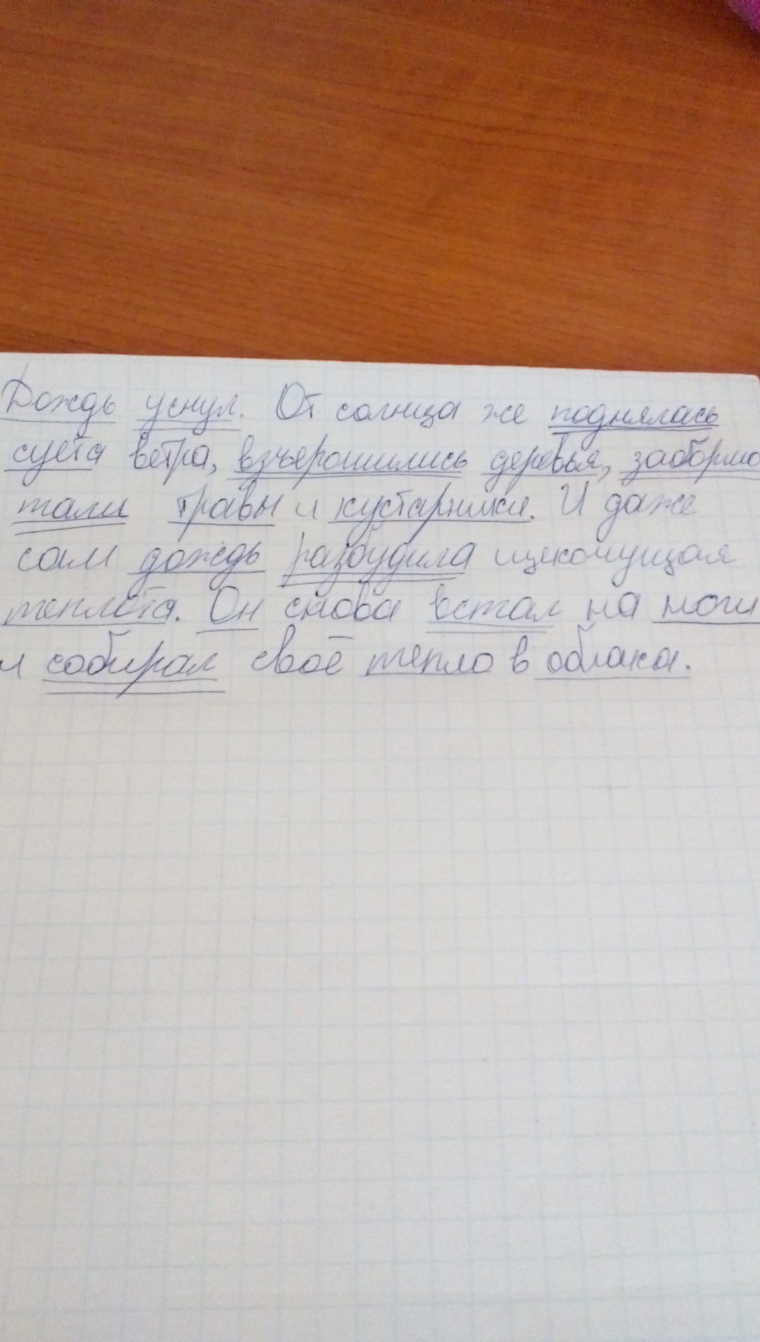 Дождь уснул.От солнца же поднялась суета ветра,взъерошились деревья,забормотали травы и кустарники.И даже сам дождь разбудила щекочущая теплота.Он снова вставал на ноги и собирал своё тепло в облака.