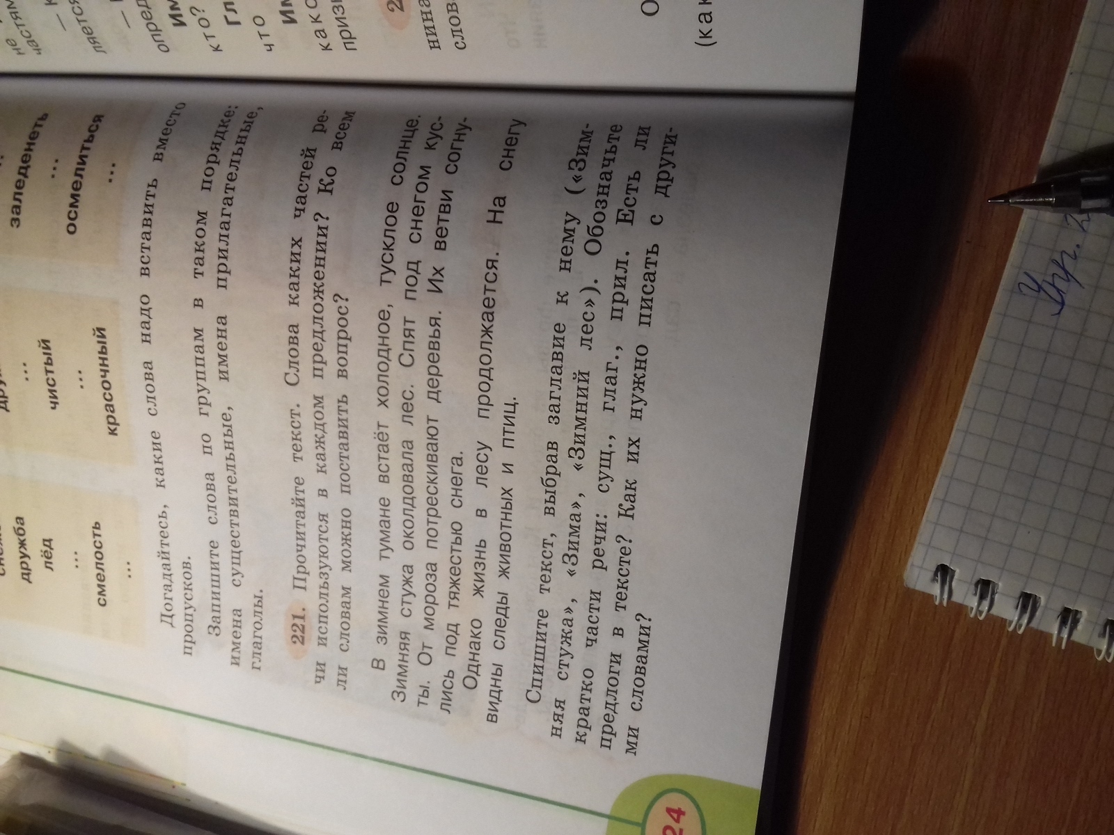 Однако(наречие) жизнь(сущ) в(пред) лесу(сущ) продолжается(глаг). На(пред) снегу(сущ) видны(глаг) следы(сущ) животных(сущ) и(союз) птиц(сущ).