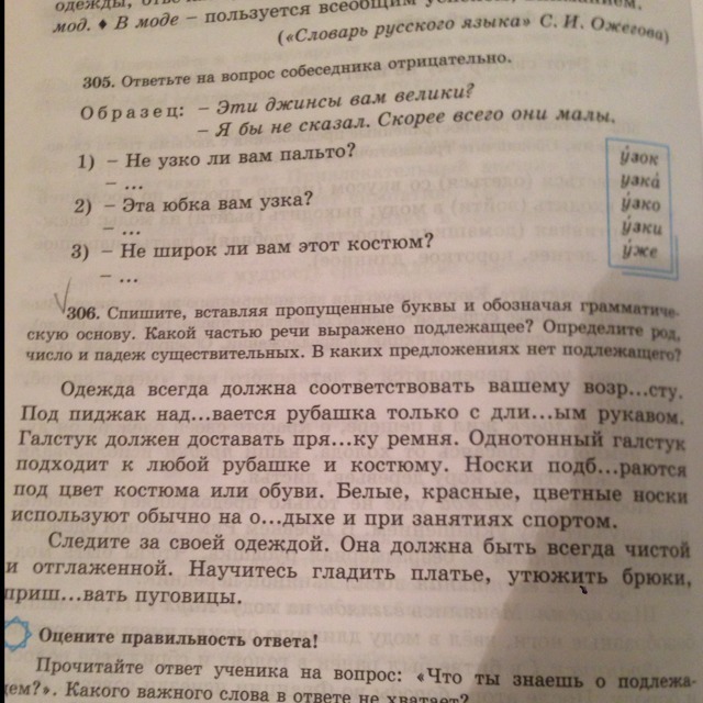возрасту,надевается,с длинным,пряжку,подбираются,отдыхе,пришивать одежда должна соответсвовать,надевается рубашка,галстук должен доставать,галстук подходит,носки подбираются,носки используют,следите,она должна быть,научитесь гладить и пришивать.подлежащие существительные,но одно подлежащие местоимение,1 предложение 2 обзац,род число и падеж определишь сам