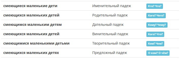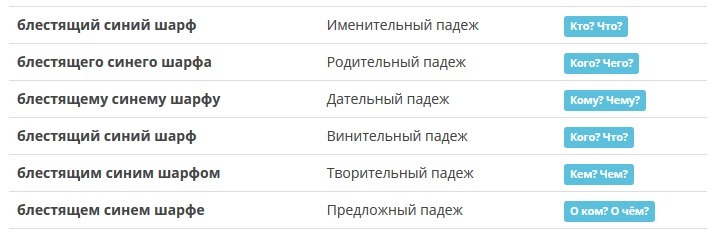 Р.п. (кого? чего?) - блестящего синего шарфа, смеющихся маленьких детей
