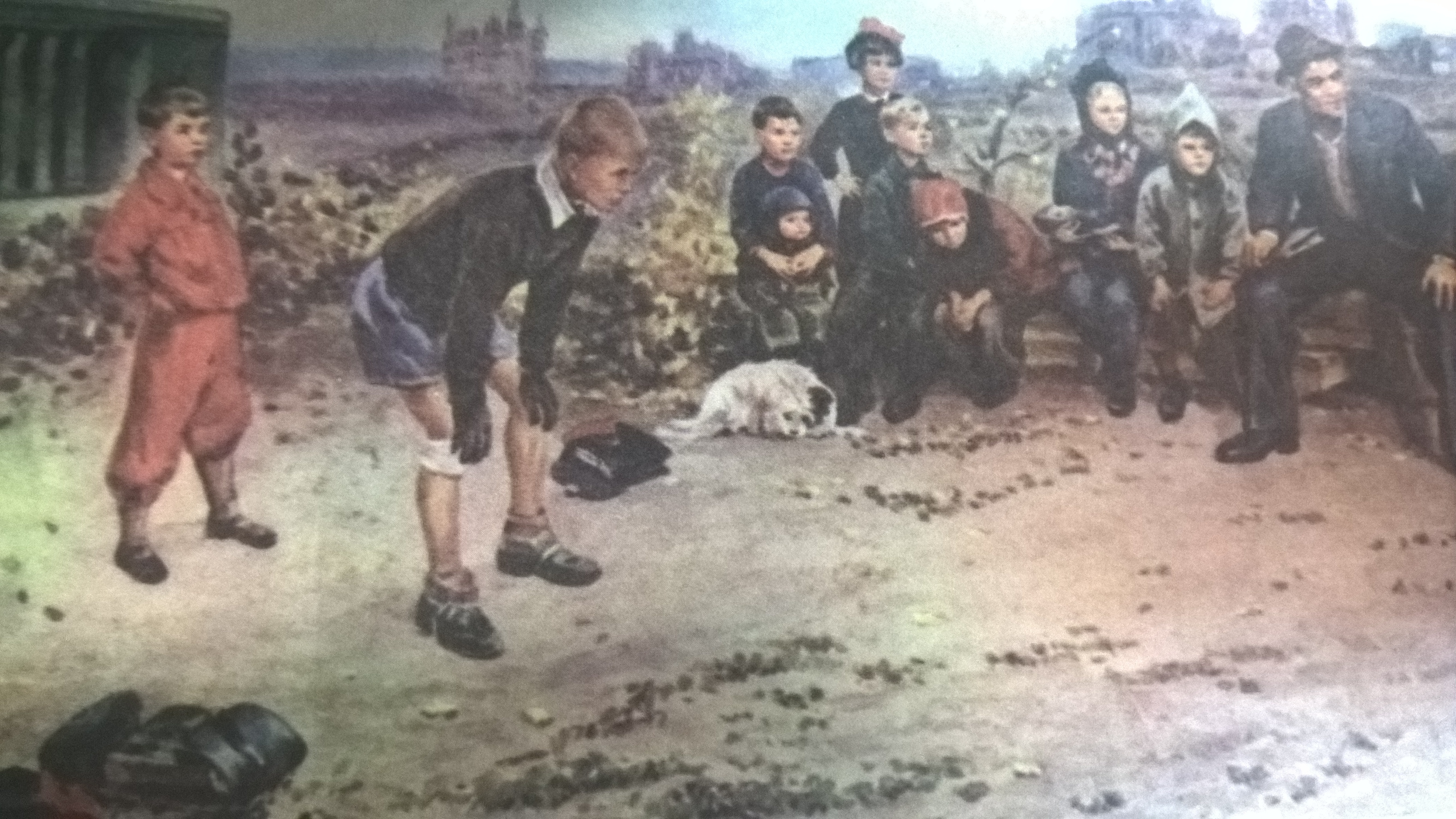 Вот я и решил однажды пойти посмотреть, как играют доморощенные футболисты. Все какое-то развлечение, да и любимая игра все же. Пустырь был немаленьким. Правда на футбольное поле он тоже мало походил. Но для игры годился. Играли ребята сразу же после школы. Границу ворот обозначили собственными ранцами. Я и еще несколько болельщиков устроились на деревянных щитах. За своих друзей пришли поболеть девочки, одноклассницы одного из игроков. Были и ребята помладше. Все мы сидели рядышком. Кое-кто из ребят пришел из дома: настолько интересен был им футбол.