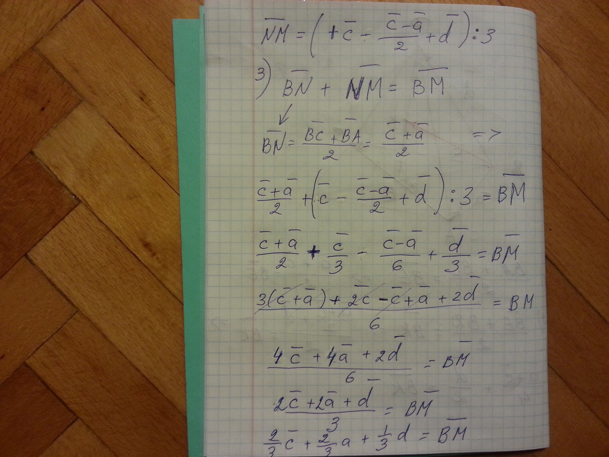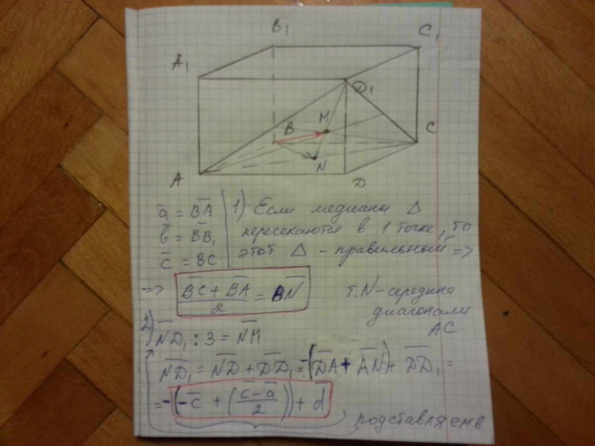 Дан параллелепипед ABCDA1B1C1D1.Медиа ны треугольника AСD1 пересекаются в точке M. Разложите вектор ВМ по векторам а = ВА, b= ВВ1, c = ВС.