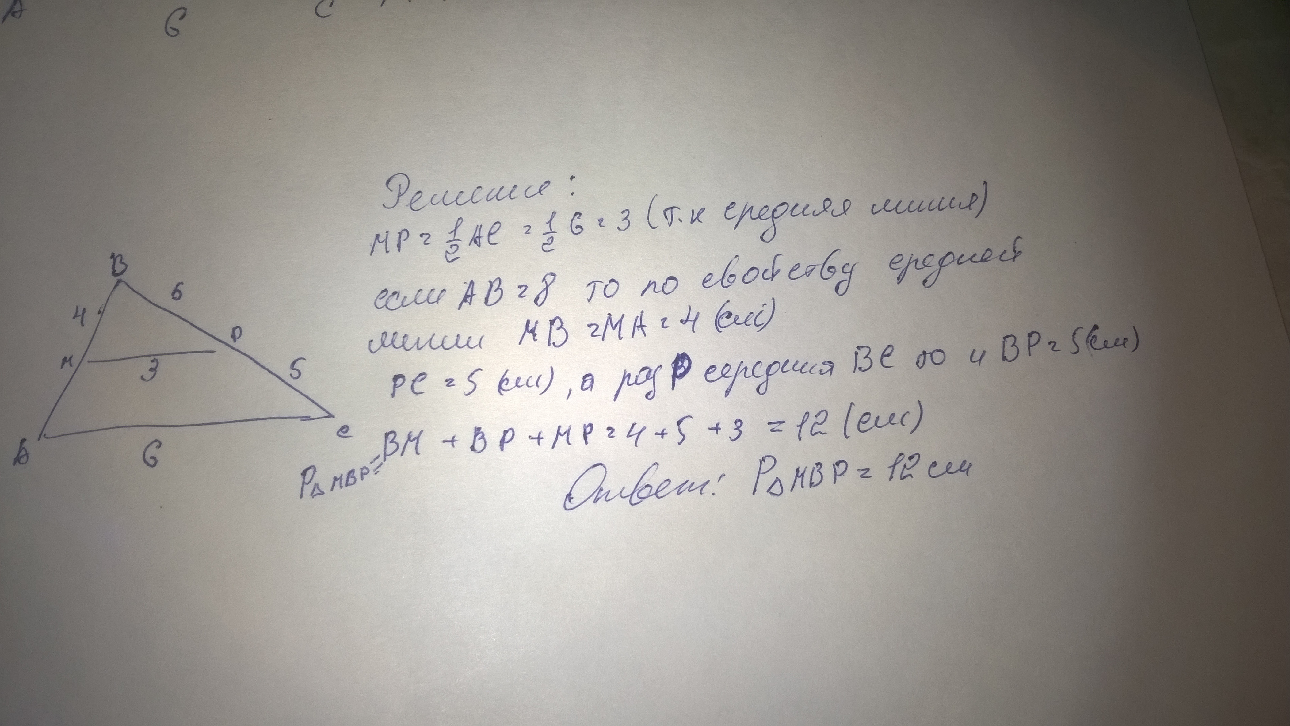 в треугольнике ABC MP- средняя линия. MP//AC. Найдите периметр треугольника BMP, если АС= 6 см, АВ= 8 см, РС= 5 см.