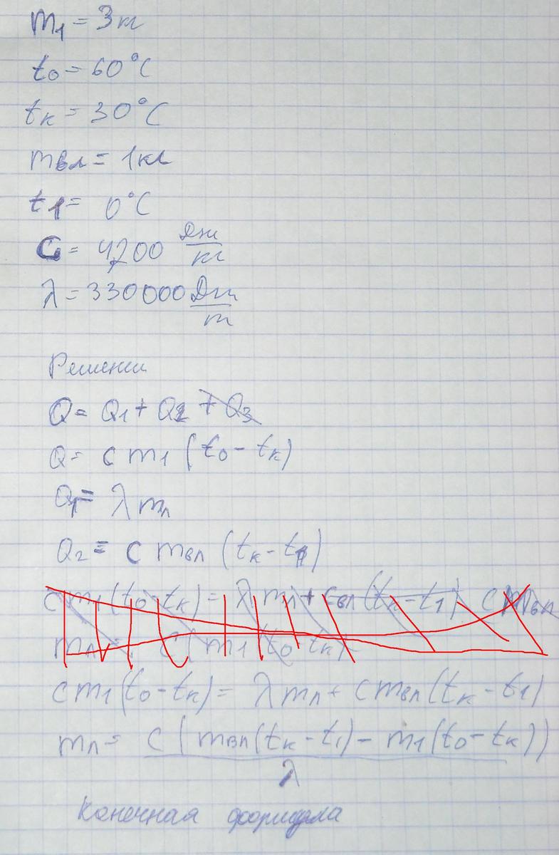 В горячую воду массой 3кг и температурой 60 С помещают смесь воды и льда общей массой 1 кг. Если в результате в сосуде устанавливается температура 30 С, от в смеси был лед массой ...... г ? Потерями теплоты пренебречь, удельная теплоемкость воды 4.2 кДжкг * С , удельная теплота плавления льда 330 кДжкг