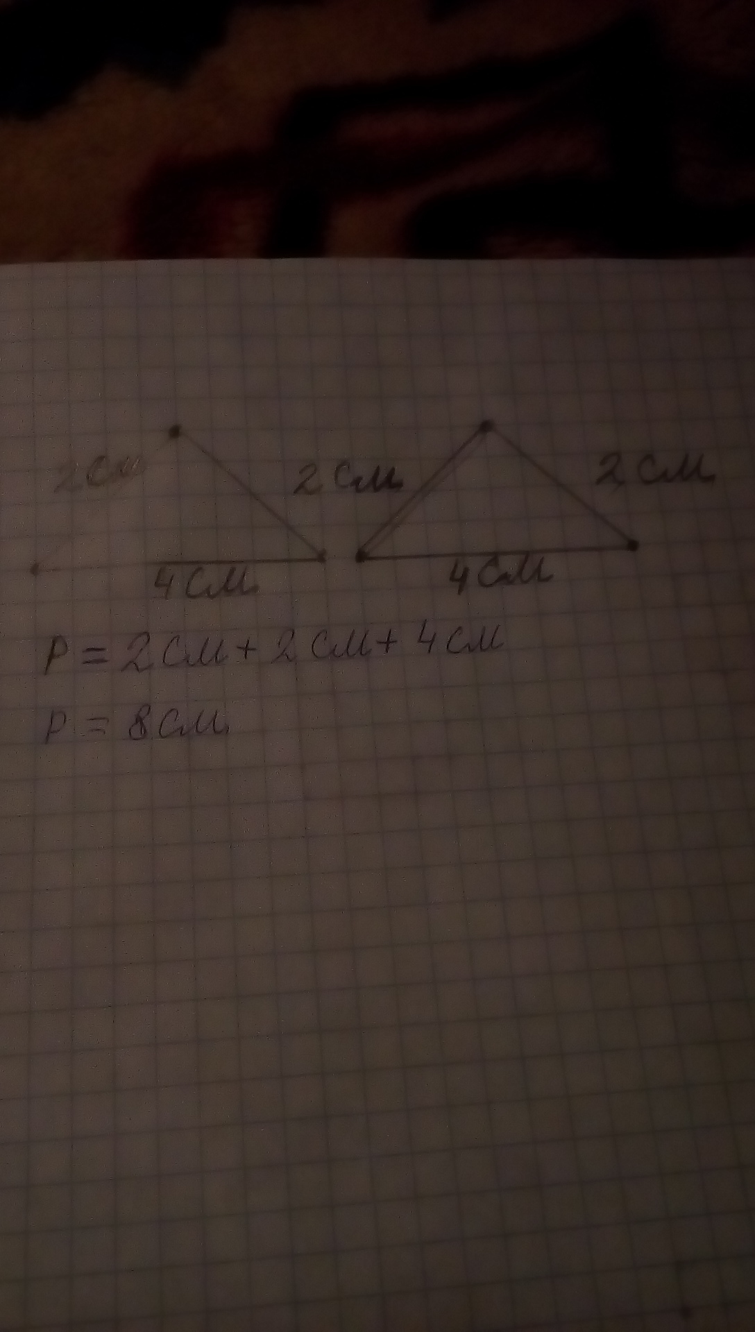 Отметь в тетради точки.соедини их отрезками так,чтобы получилось 2 треугольника. Найди периметр каждого триугольника