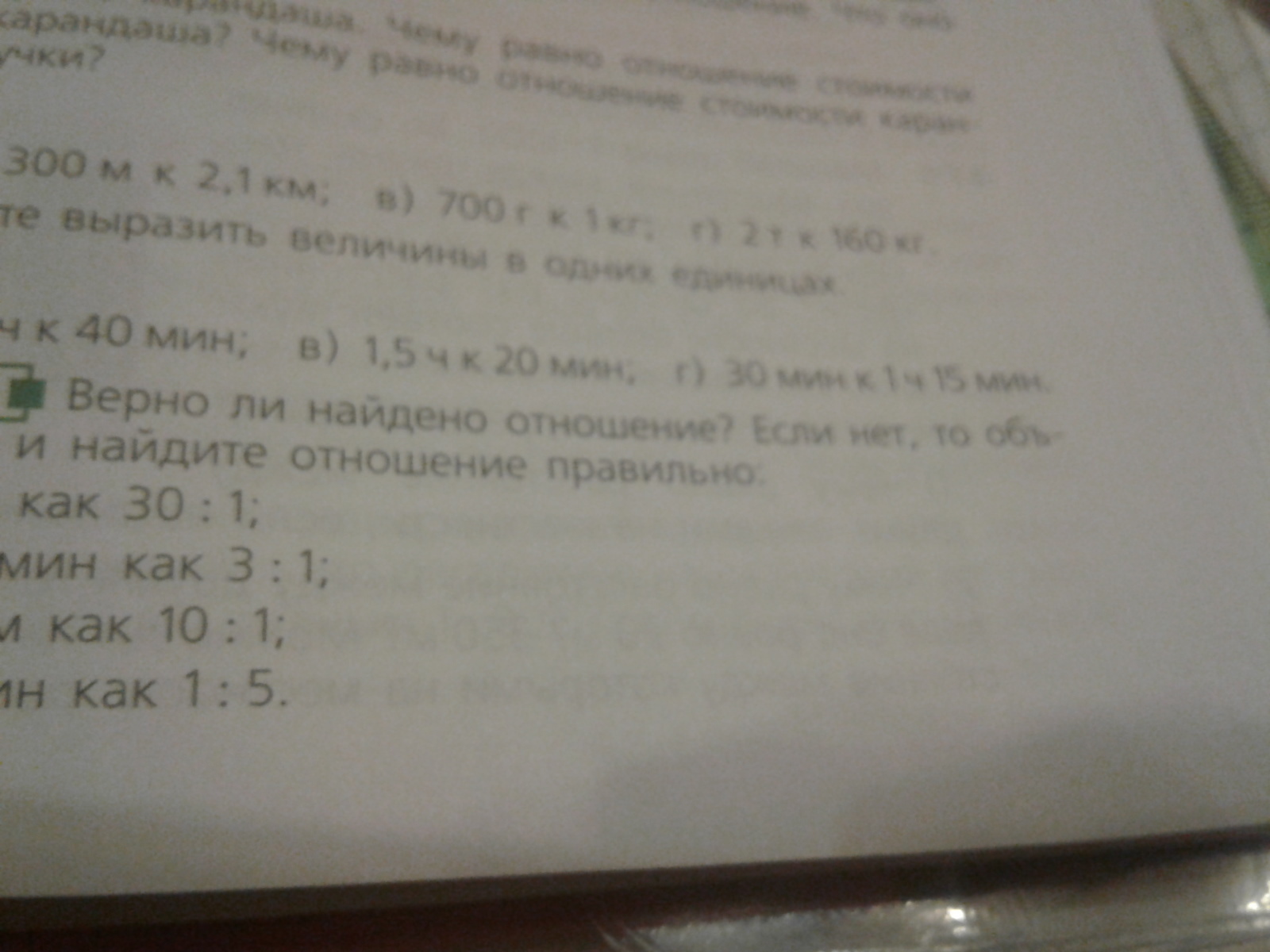 б) "1,2ч относятся к 24 мин как 3:1" - Верно, т.к. 1 и 2/10 часа = 1 и 12/60 часа = 72/60 часа = 72 минуты. А 72:24=3:1.в) "20 см относятся к 2 м как 10:1" - Неверно. Правильно будет 20 см : 200 см как 1:10.г) "36 сек относятся к 3 мин как 1:5" - Верно. 3 минуты = 3*60=180 сек и 36:180=1:5.