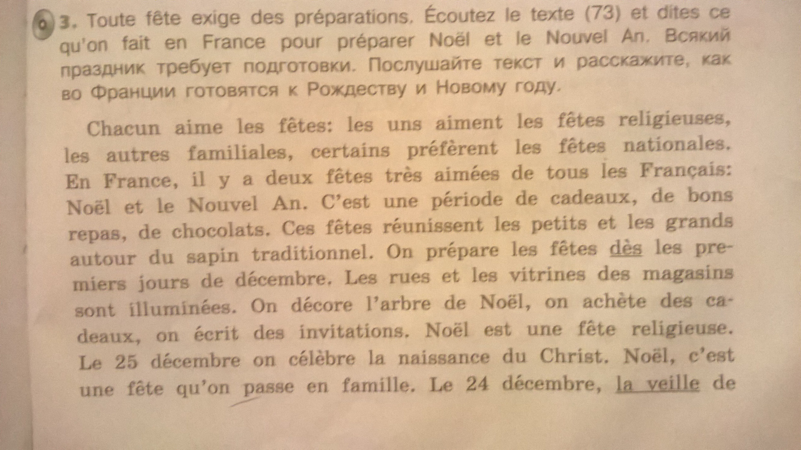Все любят праздники: некоторые, как религиозные праздники, другие семьи, некоторые предпочитают национальные праздники во Франции, есть два очень любимых праздников всех Рождества и Нового года время подарков, хорошо. питание, шоколад. Эти фестивали приносят вместе малые и большие вокруг традиционного дерева. Подготовка пиры из дней декабря, улицы и витрины подсвечиваются. Мы украшаем елку, мы покупаем Deaux, писать приглашения. Рождество это религиозный праздник. 25 декабря мы отмечаем рождение Христа. Рождество это праздник, который происходит в семьях. 24 декабря, за день.