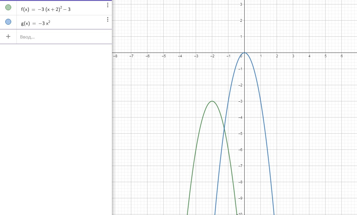 Что бы с графика y=-3x² сделать график y=-3(x+2)²-3 нужно график функции y=-3x² передвинуть на 2 единицы влево и на 3 единицы вниз.