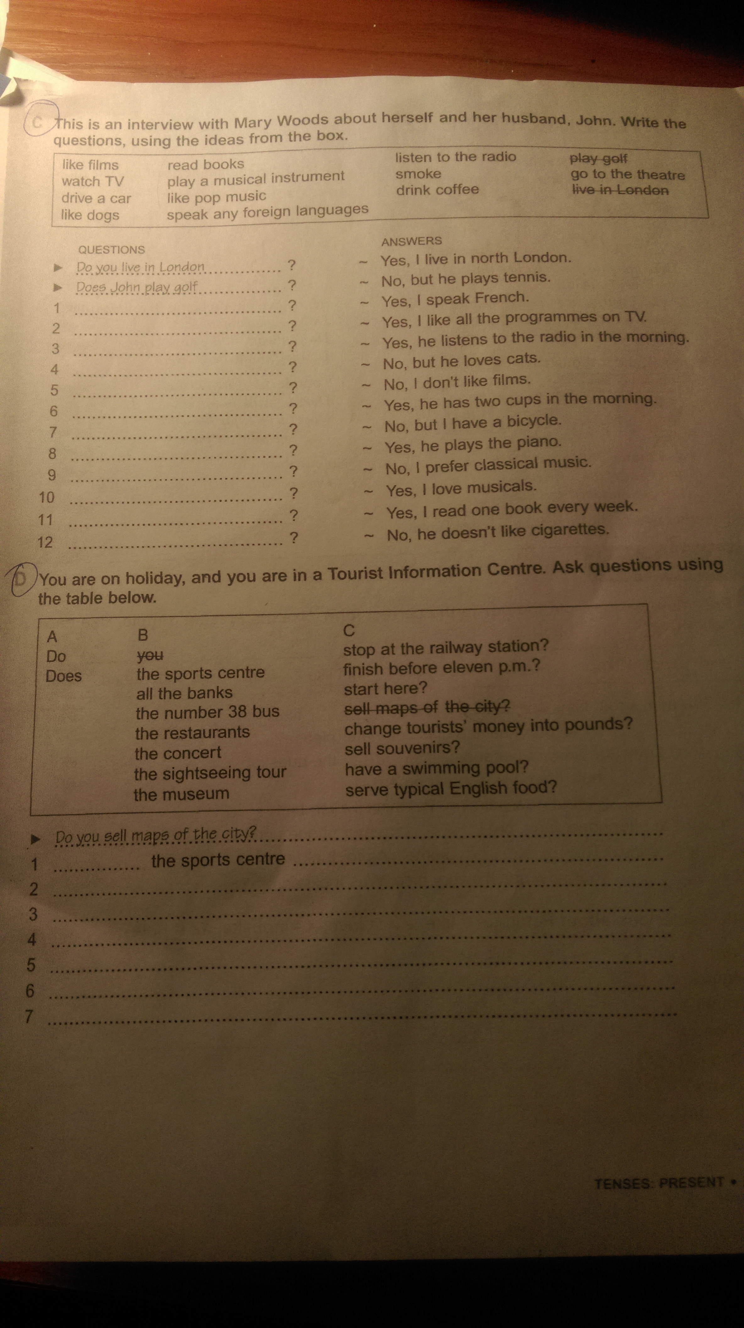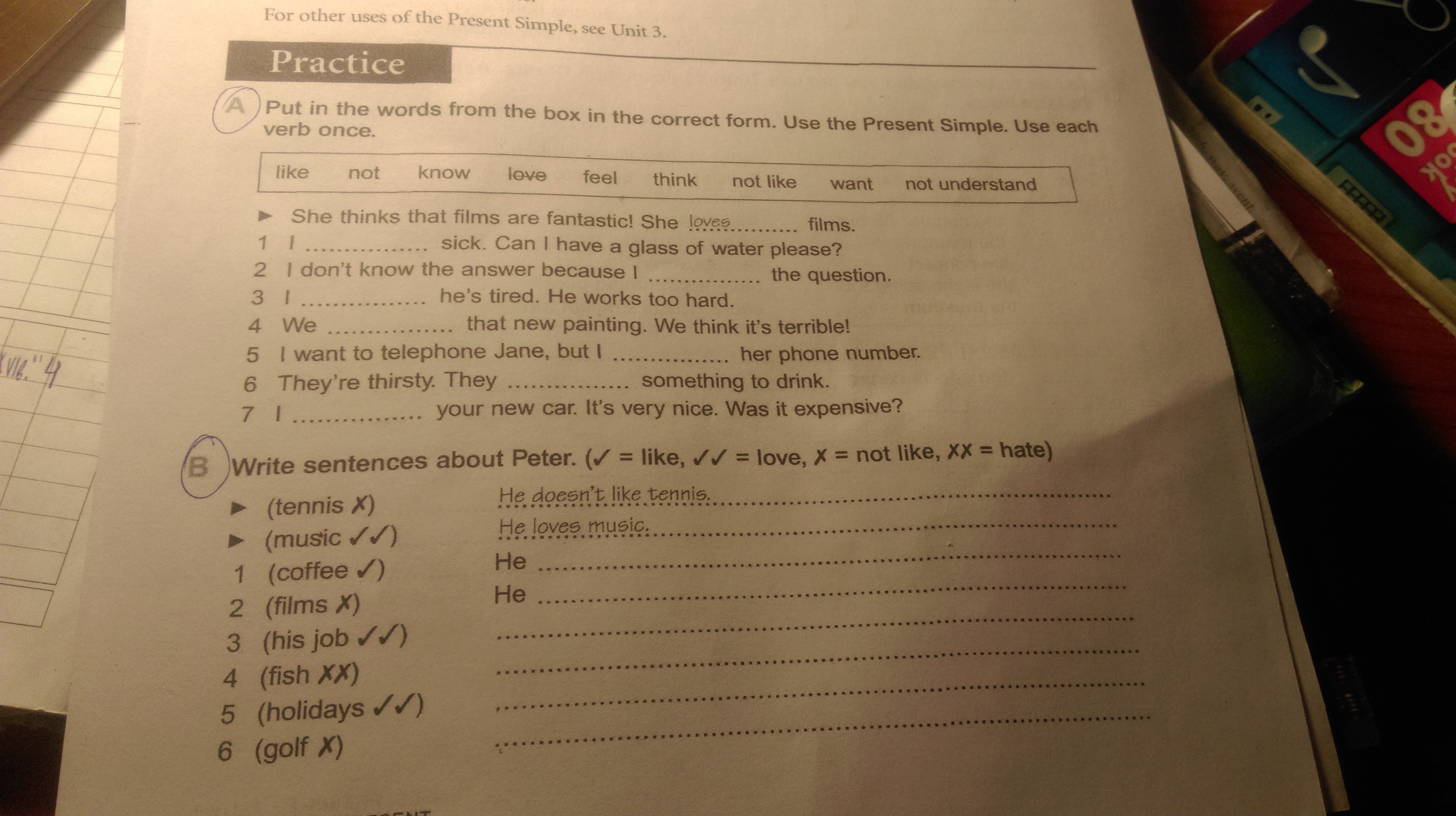 1.He likes coffee 2.he doesn't like films 3.He loves his job 4.He hates fish 5.he loves holidays 6.he doesn't like golf